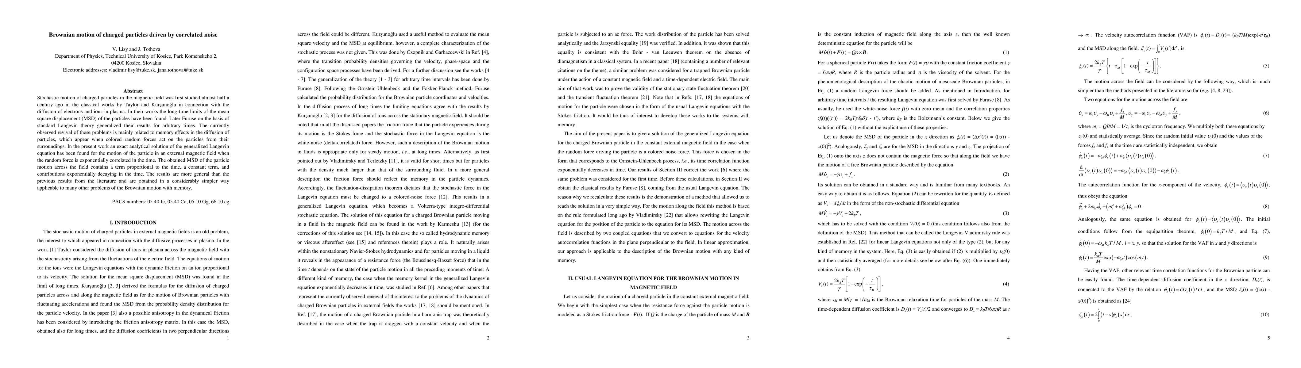 Stochastic motion of charged particles in the magnetic field was first studied almost half a century ago in the classical works by Taylor and Kursunoglu in connection with the diffusion of electrons and ions in plasma. In their works the long-time limits of the mean square displacement (MSD) of the particles have been found. Later Furuse on the basis of standard Langevin theory generalized their results for arbitrary times. The currently observed revival of these problems is mainly related to memory effects in the diffusion of particles, which appear when colored random forces act on the particles from their surroundings. In the present work an exact analytical solution of the generalized Langevin equation has been found for the motion of the particle in an external magnetic field when the random force is exponentially correlated in the time. The obtained MSD of the particle motion across the field contains a term proportional to the time, a constant term, and contributions exponentially decaying in the time. The results are more general than the previous results from the literature and are obtained in a considerably simpler way applicable to many other problems of the Brownian motion with memory.