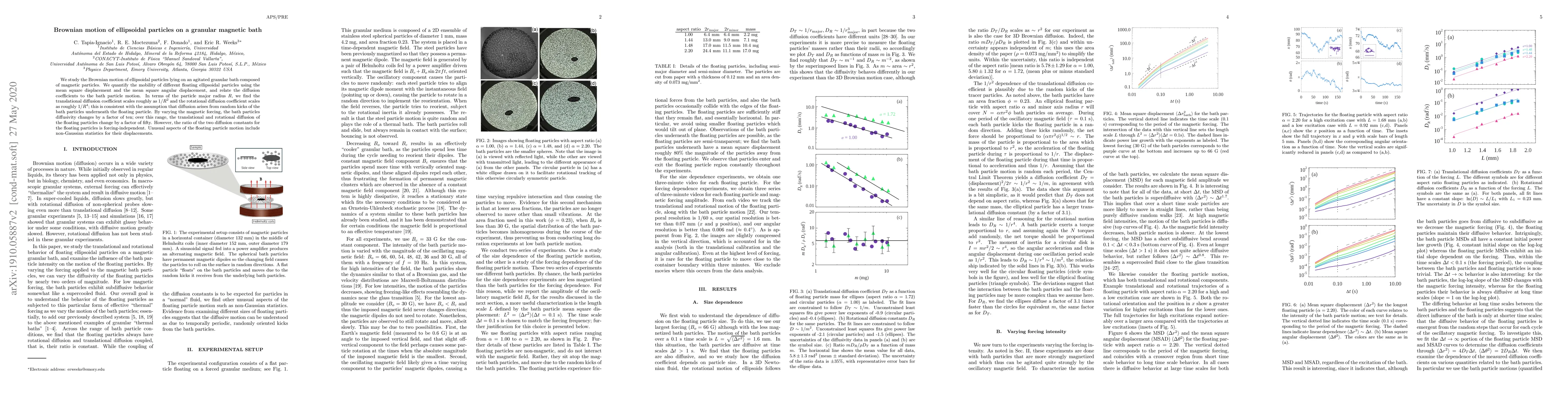 This study examines the Brownian motion of ellipsoidal particles on a magnetic granular bath, finding that translational diffusion scales with 1/R^2 and rotational diffusion with 1/R^4, where R is the major radius. Despite varying magnetic forcing altering bath particles' diffusivity by tenfold, floating particle diffusion changes by fifty times, while their diffusion ratio remains constant. Anomalous non-Gaussian displacement statistics are also noted.