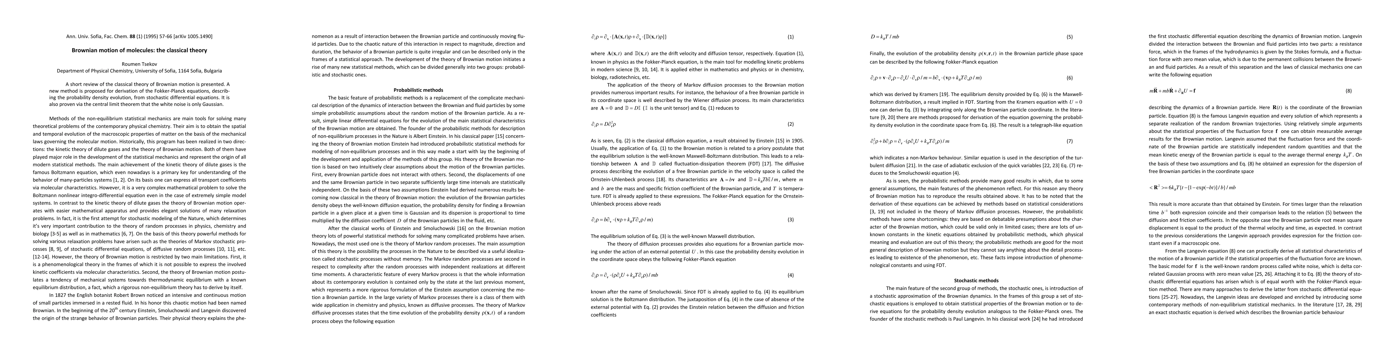 A short review of the classical theory of Brownian motion is presented. A new method is proposed for derivation of the Fokker-Planck equations, describing the probability density evolution, from stochastic differential equations. It is also proven via the central limit theorem that the white noise is only Gaussian.