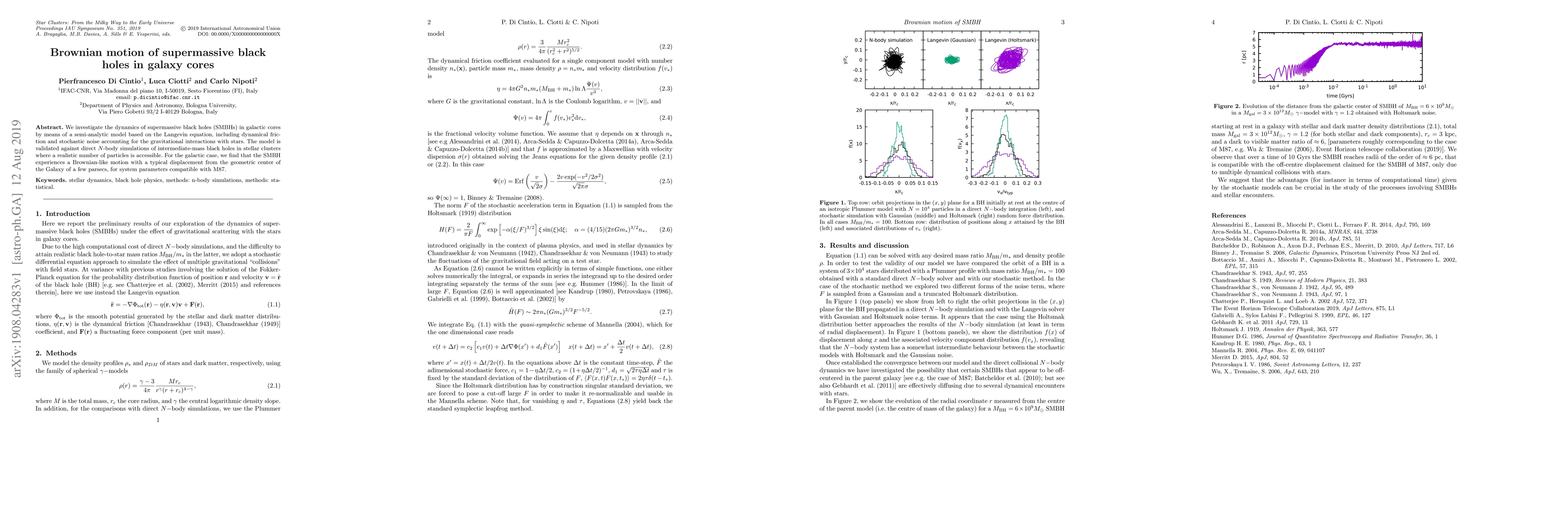 We investigate the dynamics of supermassive black holes (SMBHs) in galactic cores by means of a semi-analytic model based on the Langevin equation, including dynamical friction and stochastic noise accounting for the gravitational interactions with stars. The model is validated against direct $N$-body simulations of intermediate-mass black holes in stellar clusters where a realistic number of particles is accessible. For the galactic case, we find that the SMBH experiences a Brownian-like motion with a typical displacement from the geometric center of the Galaxy of a few parsecs, for system parameters compatible with M87. \keywords{stellar dynamics, black hole physics, methods: n-body simulations, methods: statistical.