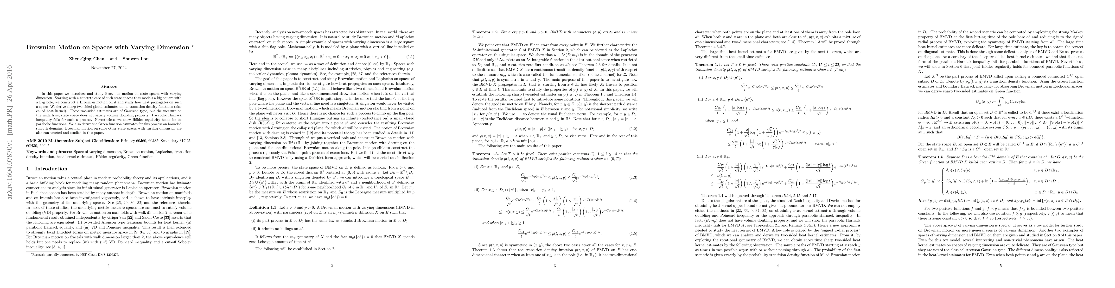 In this paper we introduce and study Brownian motion on state spaces with varying dimension. Starting with a concrete case of such state spaces that models a big square with a flag pole, we construct a Brownian motion on it and study how heat propagates on such a space. We derive sharp two-sided global estimates on its transition density functions (also called heat kernel). These two-sided estimates are of Gaussian type, but the measure on the underlying state space does not satisfy volume doubling property. Parabolic Harnack inequality fails for such a process. Nevertheless, we show Holder regularity holds for its parabolic functions. We also derive the Green function estimates for this process on bounded smooth domains. Brownian motion on some other state spaces with varying dimension are also constructed and studied in this paper.