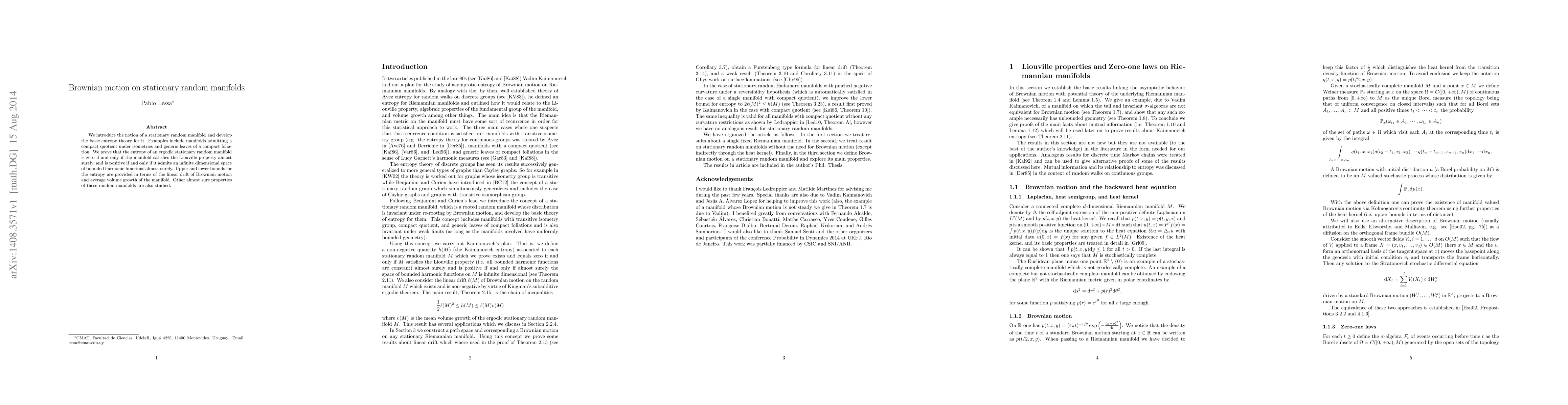 This paper introduces stationary random manifolds and develops their entropy theory, proving that the entropy is zero if the manifold has the Liouville property almost surely, and positive if it has an infinite-dimensional space of bounded harmonic functions. The study also provides bounds for entropy in terms of Brownian motion drift and volume growth.