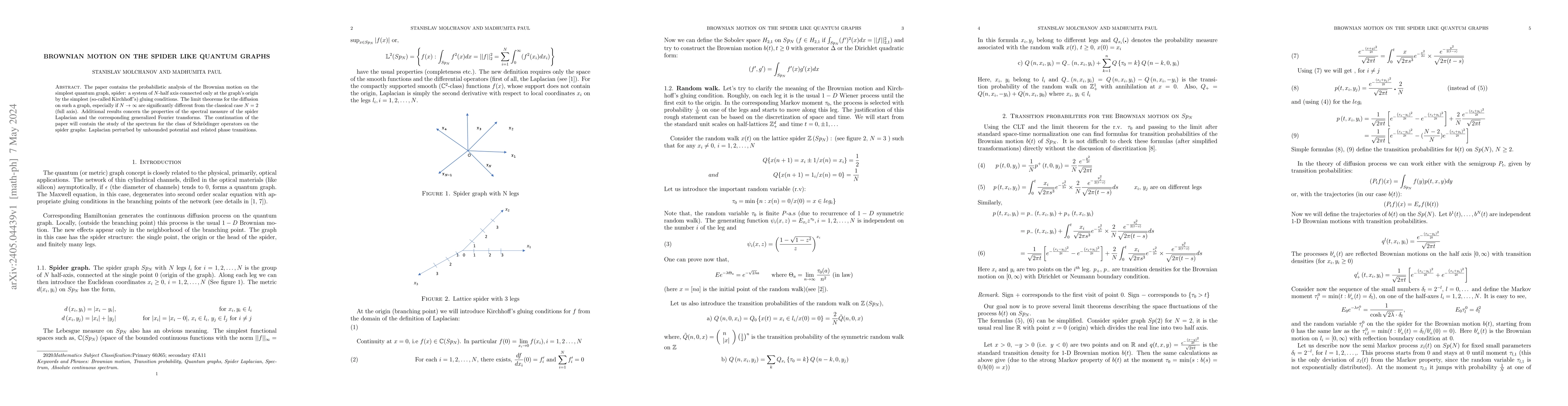 This paper analyzes the probabilistic behavior of Brownian motion on a quantum graph known as the "spider," consisting of N half-axes connected at a single point. It reveals that the limit theorems for diffusion on such graphs, especially as N approaches infinity, differ markedly from the classical case with N=2. It also investigates the spectral properties of the spider Laplacian and its generalized Fourier transforms.