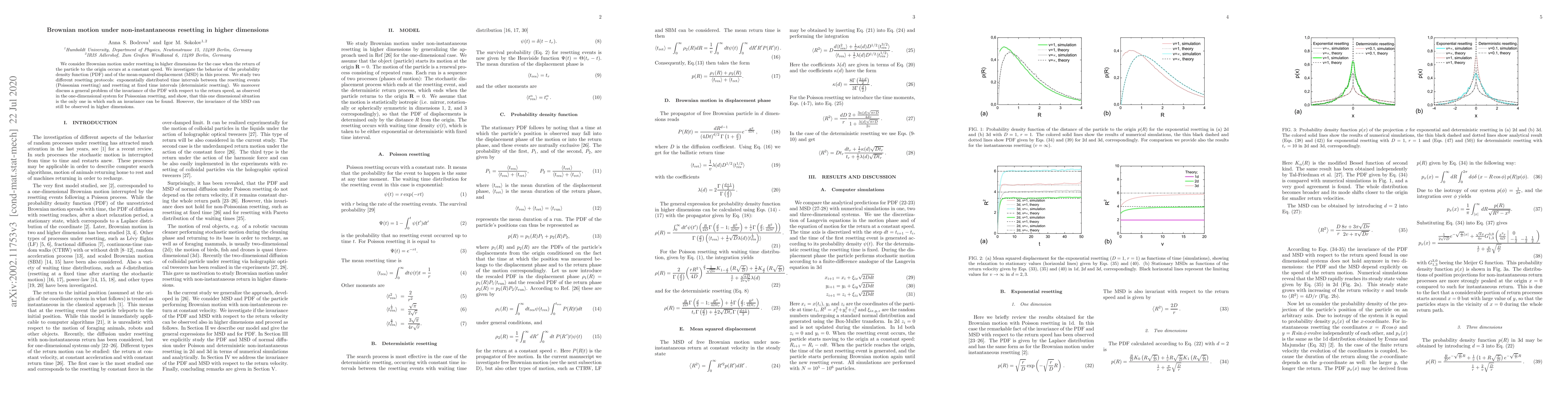This paper examines Brownian motion in higher dimensions under non-instantaneous resetting, focusing on two protocols: Poissonian resetting with exponentially distributed intervals and deterministic resetting with fixed intervals. It finds that while PDF invariance with respect to return speed only holds in one dimension for Poissonian resetting, mean-squared displacement invariance persists across higher dimensions.