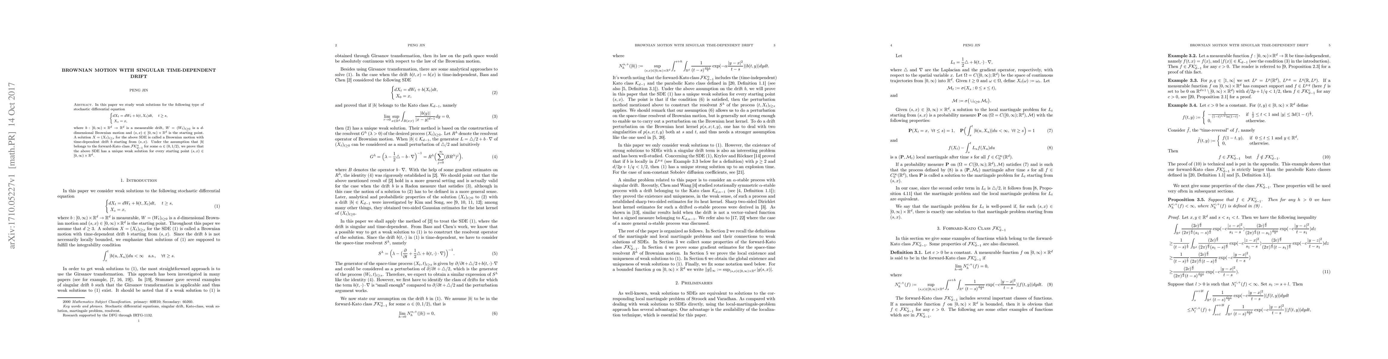 In this paper we study weak solutions for the following type of stochastic differential equation \[ dX_{t}=dW_{t}+b(t, X_{t})dt, \quad t\ge s, \quad X_{s}=x, \] where $b: [0,\infty) \times \mathbb{R}^{d} \to \mathbb{R}^{d}$ is a measurable drift, $W=(W_{t})_{t \ge 0}$ is a $d$-dimensional Brownian motion and $(s,x)\in [0,\infty) \times \mathbb{R}^{d}$ is the starting point. A solution $X=(X_t)_{t \ge s}$ for the above SDE is called a Brownian motion with time-dependent drift $b$ starting from $(s,x)$. Under the assumption that $|b|$ belongs to the forward-Kato class $\mathcal{F} \mathcal{K}_{d-1}^{\alpha}$ for some $\alpha \in (0,1/2)$, we prove that the above SDE has a unique weak solution for every starting point $(s,x)\in [0,\infty) \times \mathbb{R}^{d}$.
