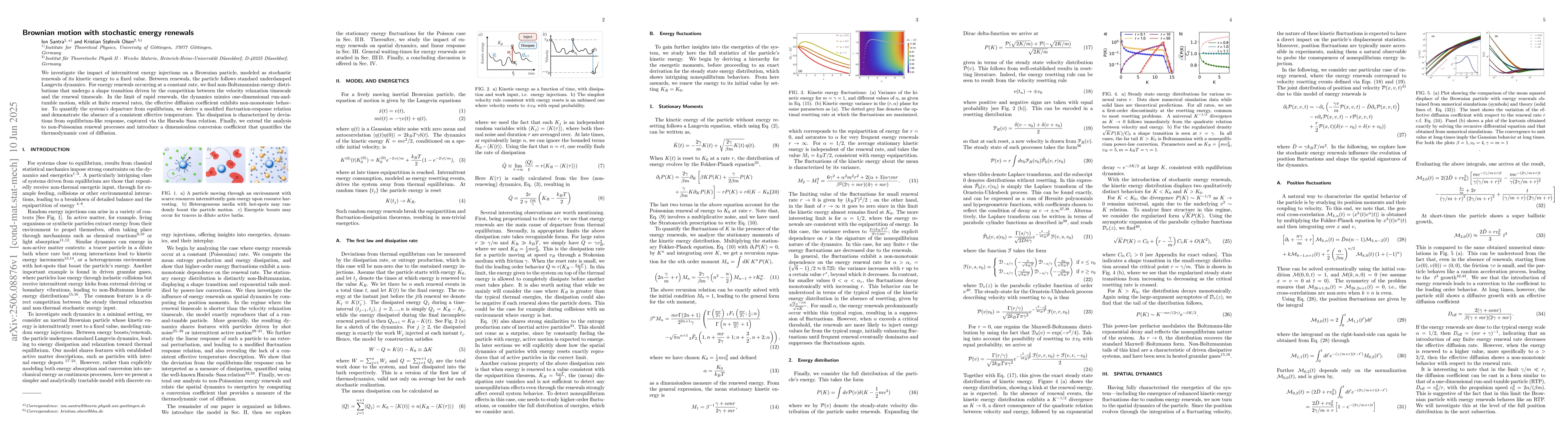 We investigate the impact of intermittent energy injections on a Brownian particle, modeled as stochastic renewals of its kinetic energy to a fixed value. Between renewals, the particle follows standard underdamped Langevin dynamics. For energy renewals occurring at a constant rate, we find non-Boltzmannian energy distributions that undergo a shape transition driven by the competition between the velocity relaxation timescale and the renewal timescale. In the limit of rapid renewals, the dynamics mimics one-dimensional run-and-tumble motion, while at finite renewal rates, the effective diffusion coefficient exhibits non-monotonic behavior. To quantify the system's departure from equilibrium, we derive a modified fluctuation-response relation and demonstrate the absence of a consistent effective temperature. The dissipation is characterized by deviations from equilibrium-like response, captured via the Harada-Sasa relation. Finally, we extend the analysis to non-Poissonian renewal processes and introduce a dimensionless conversion coefficient that quantifies the thermodynamic cost of diffusion.