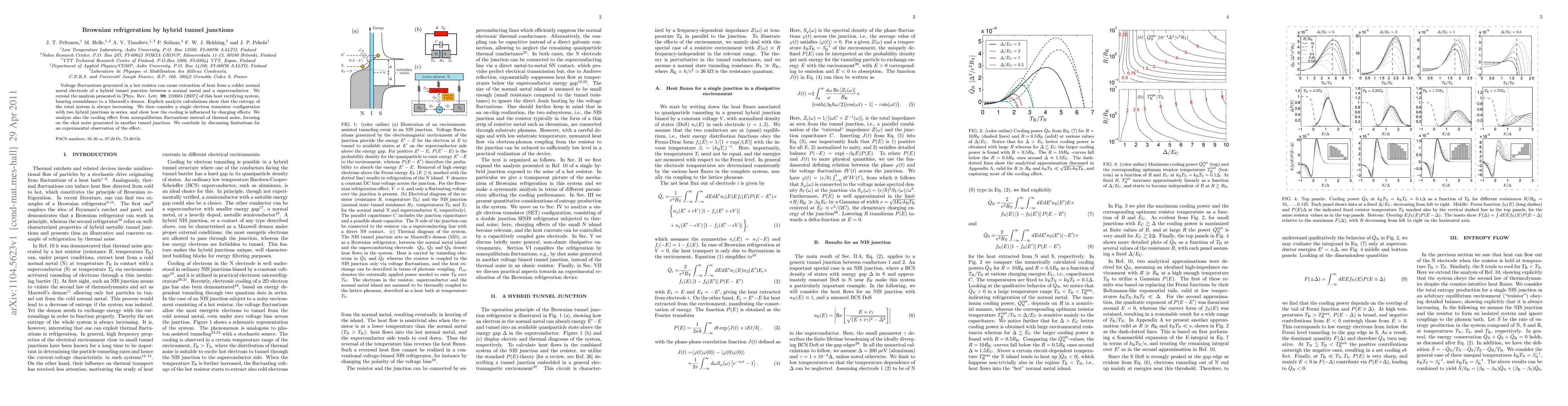 This paper investigates Brownian refrigeration via hybrid tunnel junctions, demonstrating that voltage fluctuations in a hot resistor can extract heat from a colder normal metal electrode. The study extends previous analyses and shows that the total system entropy always increases, while exploring cooling effects in configurations with two hybrid junctions and the influence of nonequilibrium fluctuations.