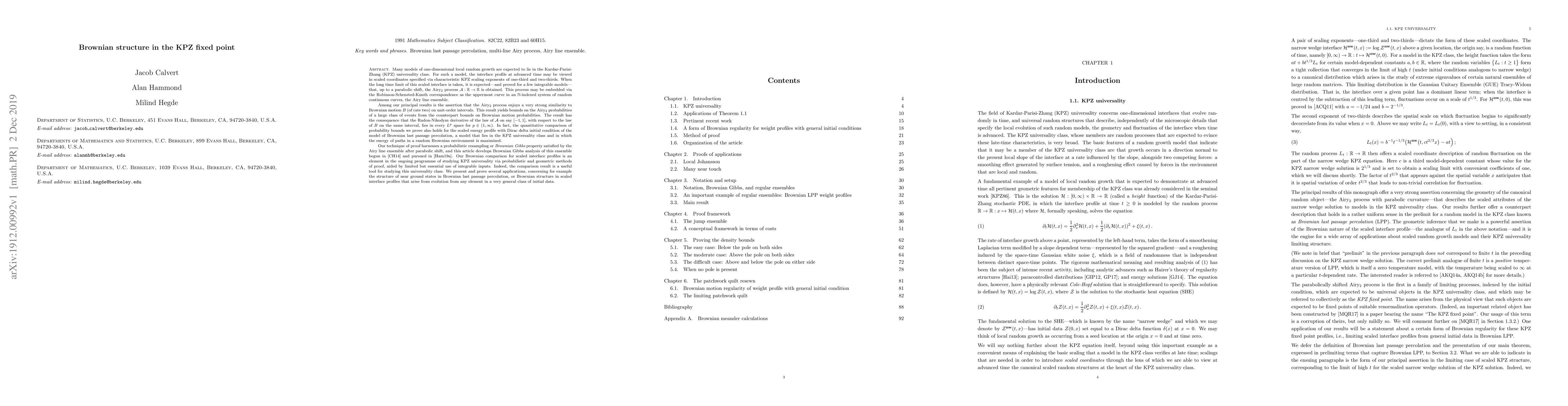 Many models of one-dimensional local random growth are expected to lie in the Kardar-Parisi-Zhang (KPZ) universality class. For such a model, the interface profile at advanced time may be viewed in scaled coordinates specified via characteristic KPZ scaling exponents of one-third and two-thirds. When the long time limit of this scaled interface is taken, it is expected -- and proved for a few integrable models -- that, up to a parabolic shift, the Airy$_2$ process $\mathcal{A}:\mathbb{R} \to \mathbb{R}$ is obtained. This process may be embedded via the Robinson-Schensted-Knuth correspondence as the uppermost curve in an $\mathbb{N}$-indexed system of random continuous curves, the Airy line ensemble. Among our principal results is the assertion that the Airy$_2$ process enjoys a very strong similarity to Brownian motion $B$ (of rate two) on unit-order intervals; as a consequence, the Radon-Nikodym derivative of the law of $\mathcal{A}$ on say $[-1,1]$, with respect to the law of $B$ on this interval, lies in every $L^p$ space for $p \in (1,\infty)$. Our technique of proof harnesses a probabilistic resampling or {\em Brownian Gibbs} property satisfied by the Airy line ensemble after parabolic shift, and this article develops Brownian Gibbs analysis of this ensemble begun in [CH14] and pursued in [Ham19a]. Our Brownian comparison for scaled interface profiles is an element in the ongoing programme of studying KPZ universality via probabilistic and geometric methods of proof, aided by limited but essential use of integrable inputs. Indeed, the comparison result is a useful tool for studying this universality class. We present and prove several applications, concerning for example the structure of near ground states in Brownian last passage percolation, or Brownian structure in scaled interface profiles that arise from evolution from any element in a very general class of initial data.