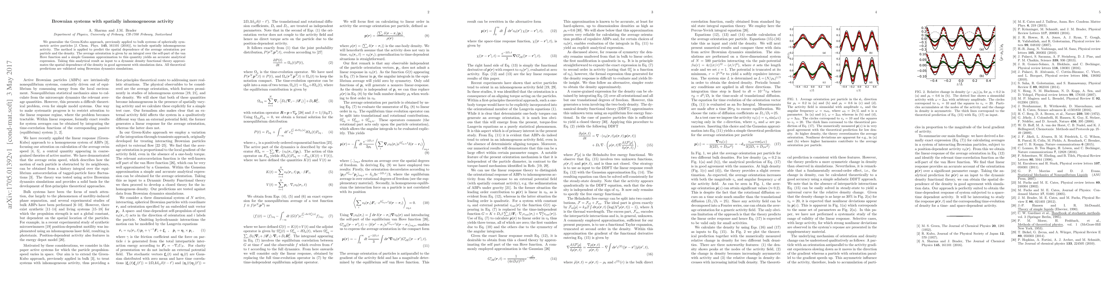 We generalize the Green-Kubo approach, previously applied to bulk systems of spherically symmetric active particles [J. Chem. Phys. 145, 161101 (2016)], to include spatially inhomogeneous activity. The method is applied to predict the spatial dependence of the average orientation per particle and the density. The average orientation is given by an integral over the self-part of the van Hove function and a simple Gaussian approximation to this quantity yields an accurate analytical expression. Taking this analytical result as input to a dynamic density functional theory approximates the spatial dependence of the density in good agreement with simulation data. All theoretical predictions are validated using Brownian dynamics simulations.