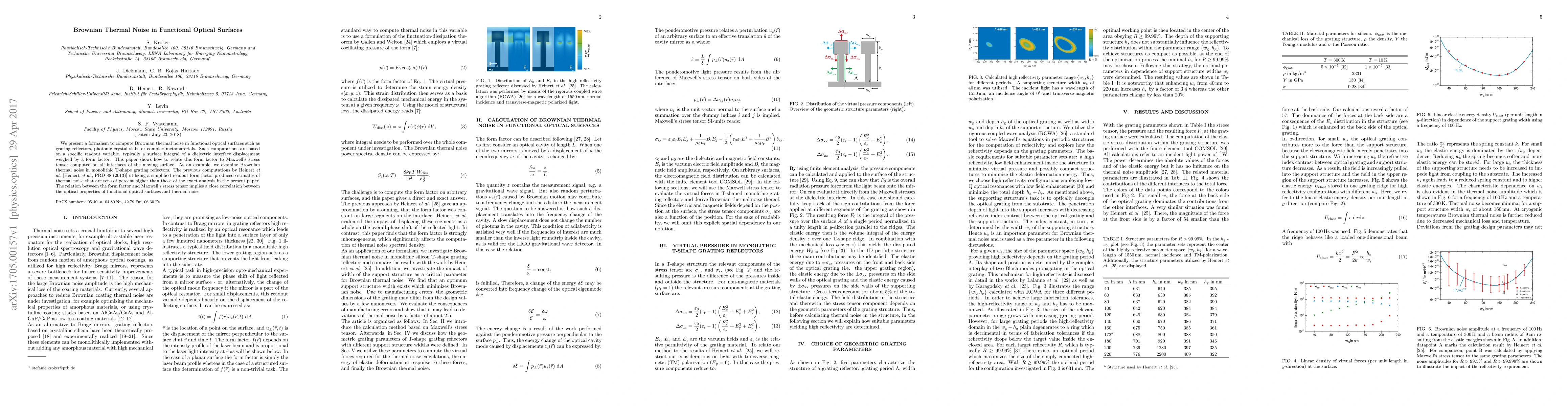 This paper develops a formalism for calculating Brownian thermal noise in functional optical surfaces, linking a specific readout variable to Maxwell's stress tensor, and demonstrates its application to T-shape grating reflectors, showing more accurate noise estimates compared to previous simplified methods.