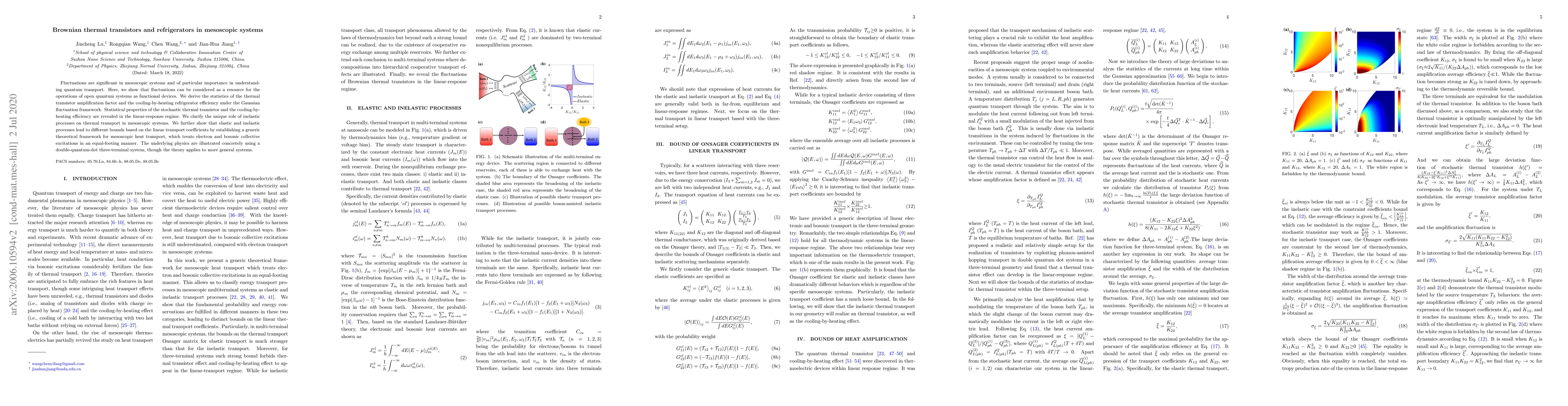 This paper explores the use of fluctuations in mesoscopic systems to design thermal transistors and refrigerators, deriving statistical properties and efficiency under Gaussian fluctuations. It establishes a theoretical framework that treats both elastic and inelastic processes equally, demonstrating unique roles in thermal transport and illustrating the physics with a double-quantum-dot system.