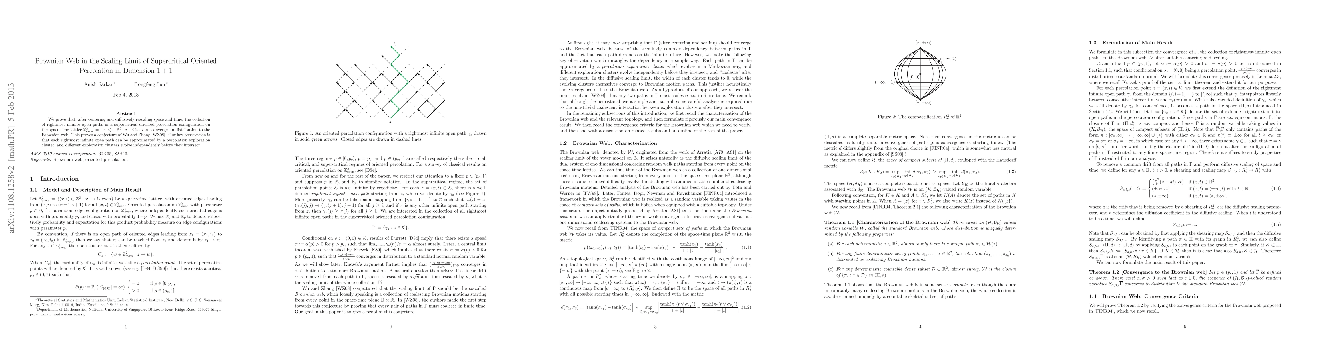 Summary: The paper proves that supercritical oriented percolation in dimension 1+1 converges to the Brownian web after appropriate scaling, confirming a conjecture by Wu and Zhang. The key insight is that rightmost infinite open paths can be approximated by independent percolation exploration clusters.