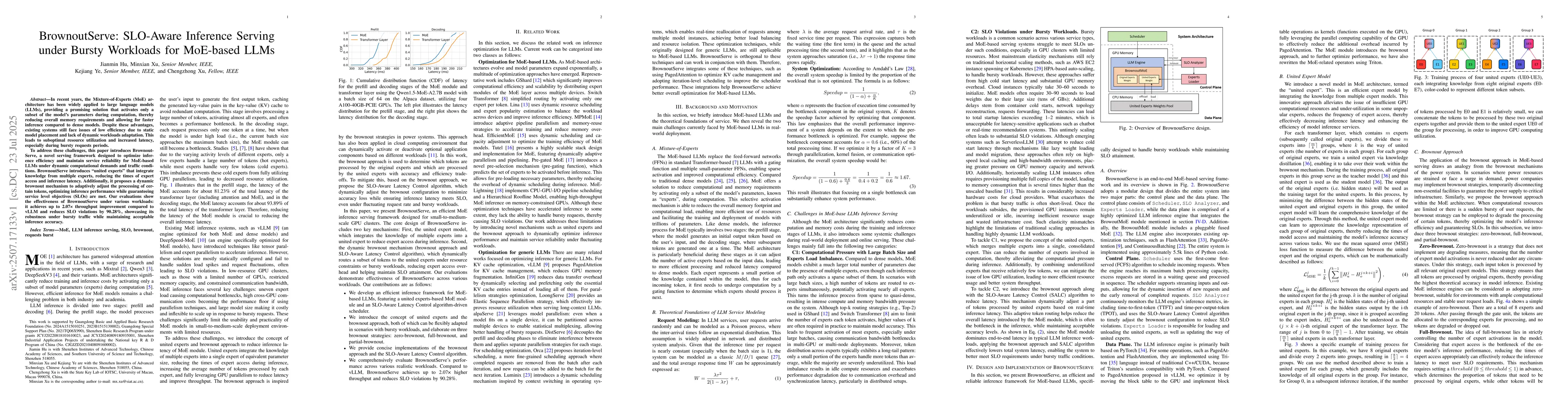 BrownoutServe is a new serving framework for MoE-based large language models that enhances efficiency and reliability during fluctuating workloads. It introduces 'united experts' to minimize expert access and latency, and a dynamic 'brownout' mechanism to adaptively manage token processing, achieving up to 2.07x throughput improvement and reducing SLO violations by 90.28% without significant accuracy loss.