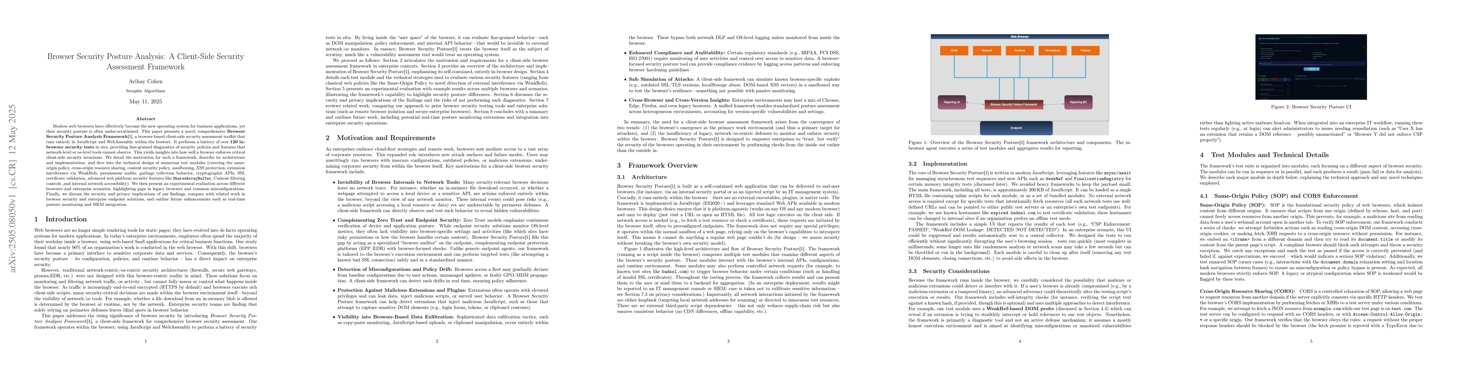 A new browser security framework assesses client-side security in 120+ tests, revealing gaps in legacy browsers and common misconfigurations, providing insights for improving browser security posture.