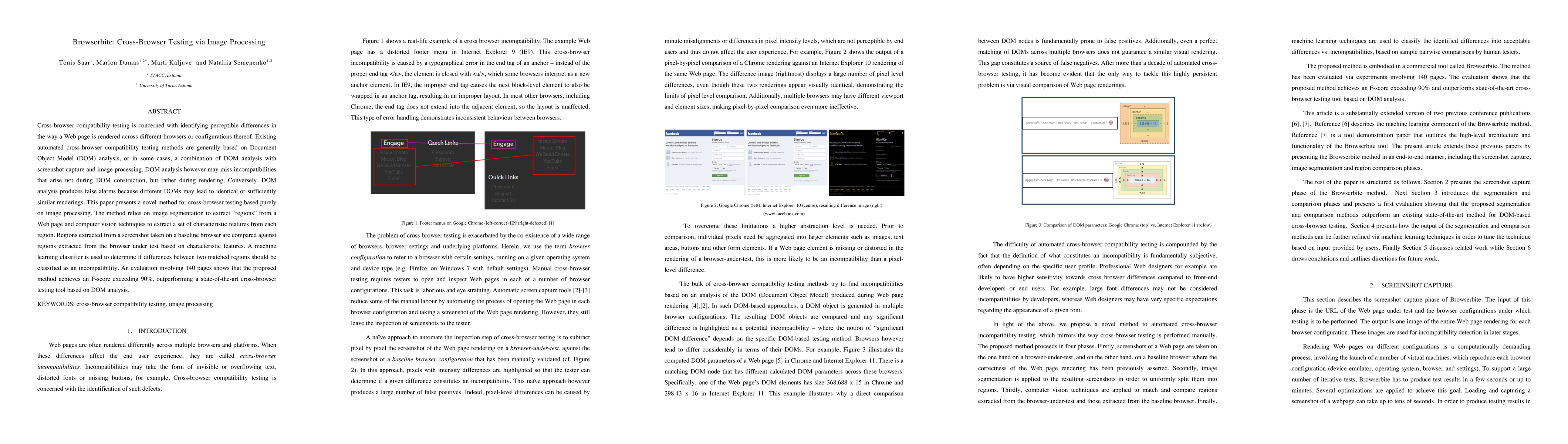 The paper introduces Browserbite, a novel cross-browser testing method based on image processing, which uses image segmentation and computer vision to detect rendering differences, outperforming DOM analysis-based tools with an F-score exceeding 0.9 in evaluations.