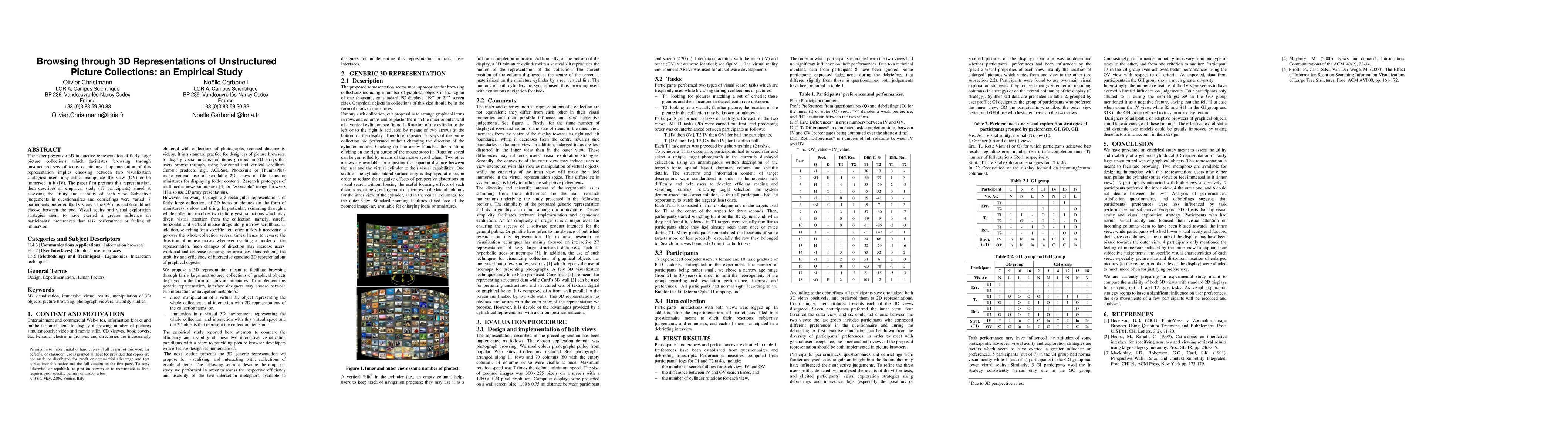 The paper presents a 3D interactive representation of fairly large picture collections which facilitates browsing through unstructured sets of icons or pictures. Implementation of this representation implies choosing between two visualization strategies: users may either manipulate the view (OV) or be immersed in it (IV). The paper first presents this representation, then describes an empirical study (17 participants) aimed at assessing the utility and usability of each view. Subjective judgements in questionnaires and debriefings were varied: 7 participants preferred the IV view, 4 the OV one, and 6 could not choose between the two. Visual acuity and visual exploration strategies seem to have exerted a greater influence on participants' preferences than task performance or feeling of immersion.