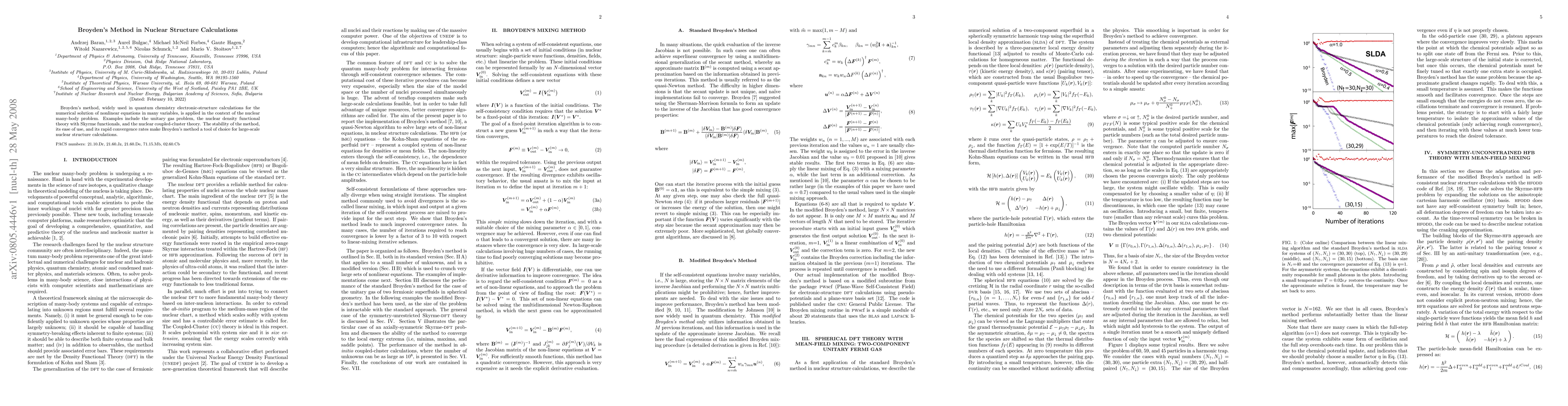 Broyden's method is effectively applied to solve nonlinear equations in nuclear structure calculations, demonstrating stability, ease of use, and rapid convergence in contexts like nuclear density functional theory and coupled-cluster theory. Its efficiency makes it a preferred choice for large-scale nuclear structure problems.