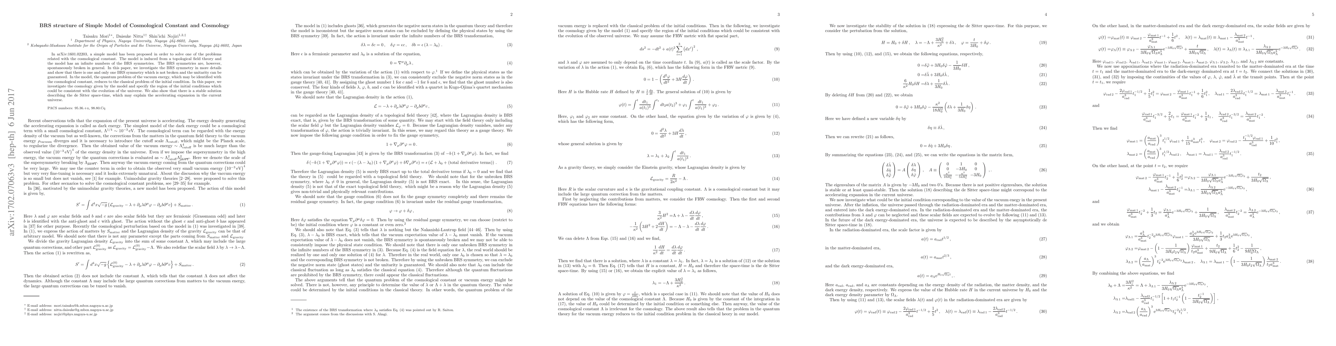 In arXiv:1601.02203, a simple model has been proposed in order to solve one of the problems related with the cosmological constant. The model is given by a topological field theory and the model has an infinite numbers of the BRS symmetries. The BRS symmetries are, however, spontaneously broken in general. In this paper, we investigate the BRS symmetry in more details and show that there is one and only one BRS symmetry which is not broken and the unitarity can be guaranteed. In the model, the quantum problem of the vacuum energy, which may be identified with the cosmological constant, reduces to the classical problem of the initial condition. In this paper, we investigate the cosmology given by the model and specify the region of the initial conditions which could be consistent with the evolution of the universe. We also show that there is a stable solution describing the de Sitter space-time, which may explain the accelerating expansion in the current universe.