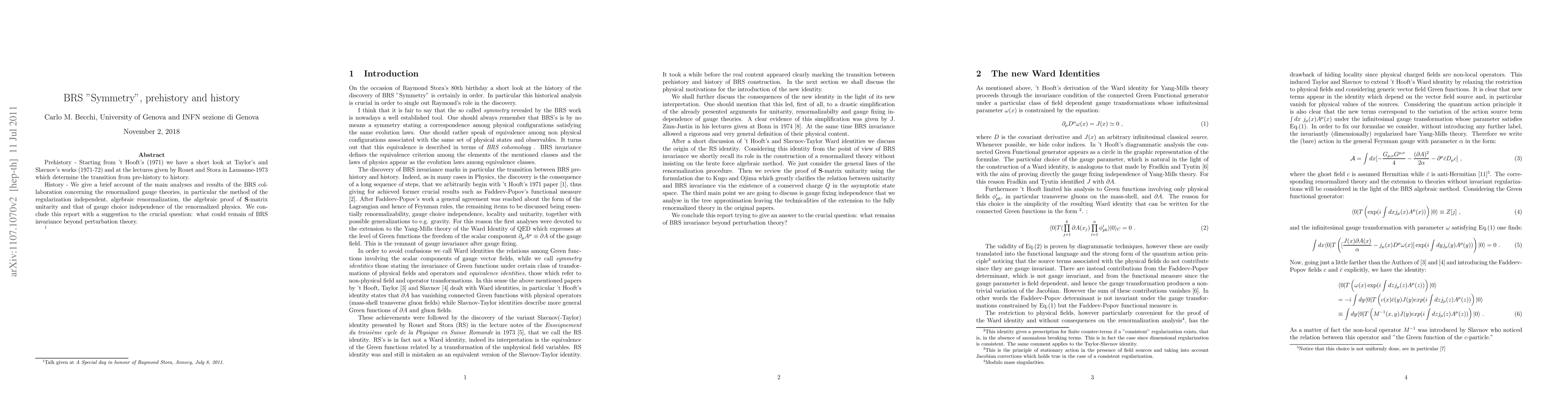 This paper provides a concise overview of the prehistory and history of the BRS symmetry, tracing its origins from 't Hooft's 1971 work through Taylor and Slavnov's contributions and the pivotal 1973 Lausanne lectures. It then summarizes key achievements of the BRS collaboration, including regularization-independent algebraic renormalization and proofs of S-matrix unitarity and gauge choice independence, concluding with a reflection on the future of BRS invariance beyond perturbation theory.
