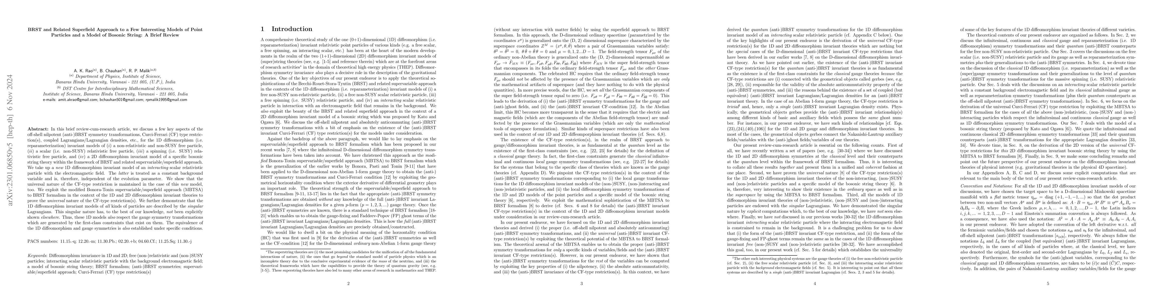 In this brief review-cum-research article, we discuss the off-shell nilpotent (anti-)BRST symmetry transformations, (anti-)BRST invariant Curci-Ferrari (CF) type restriction(s), coupled Lagrangians/Lagrangian densities, etc., for the 1D diffeomorphism (i.e. reparameterization) invariant models of $(i)$ a non-relativistic and non-SUSY free particle, $(ii)$ a scalar (i.e. non-SUSY) relativistic free particle, $(iii)$ a spinning (i.e. SUSY) relativistic free particle, and $(iv)$ a 2D diffeomorphism invariant model of a specific bosonic string theory within the framework of BRST and related supervariable/superfield approach. We take up a new 1D diffeomorphism (i.e. reparameterization) invariant model of an interacting scalar relativistic particle with the electromagnetic field. The latter is treated as a constant background variable and is, therefore, independent of the evolution parameter of the trajectory of the above interacting scalar relativistic particle. We show that the universal nature of the CF-type restriction is maintained in the case of this new model, too. The universal nature of the CF-type restriction(s) is proven by using the modified Bonora-Tonin supervariable/superfield approach (MBTSA) to BRST formalism in the context of 1D and 2D diffeomorphism invariant theories. We further demonstrate that the 1D diffeomorphism invariant models of all kinds of particles are described by the singular Lagrangians. Thus, they also respect the infinitesimal gauge symmetry transformations that are generated by the first-class constraints that exist on them. The equivalence of the 1D diffeomorphism and gauge symmetries is explicitly clarified under specific conditions.