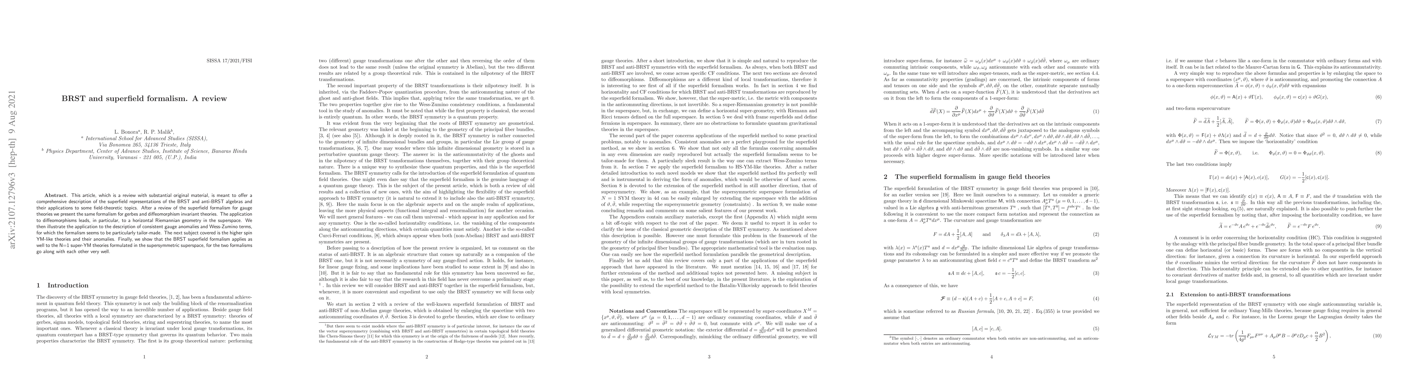 This article, which is a review with substantial original material, is meant to offer a comprehensive description of the superfield representations of the BRST and anti-BRST algebras and their applications to some field-theoretic topics. After a review of the superfield formalism for gauge theories we present the same formalism for gerbes and diffeomorphism invariant theories. The application to diffeomorphisms leads, in particular, to a horizontal Riemannian geometry in the superspace. We then illustrate the application to the description of consistent gauge anomalies and Wess-Zumino terms, for which the formalism seems to be particularly tailor-made. The next subject covered is the higher spin YM-like theories and their anomalies. Finally, we show that the BRST superfield formalism applies as well to the N=1 super-YM theories formulated in the supersymmetric superspace, for the two formalisms go along with each other very well.