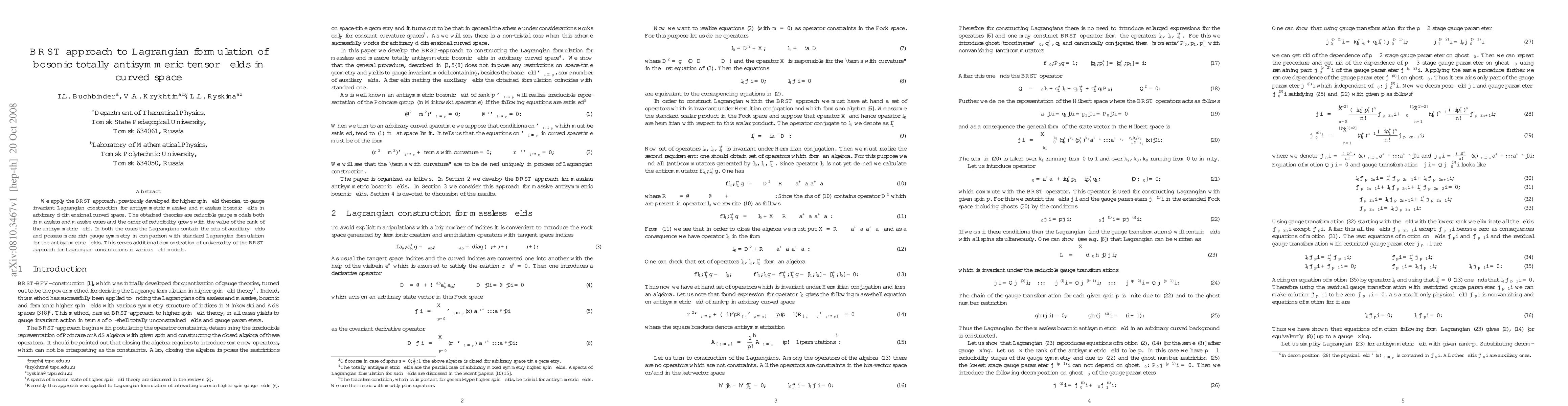The paper applies the BRST approach to construct gauge invariant Lagrangians for bosonic totally antisymmetric tensor fields in curved space, showing that the resulting theories are reducible gauge models with enhanced gauge symmetry and auxiliary fields. This demonstrates the BRST method's universality in formulating diverse field theories.