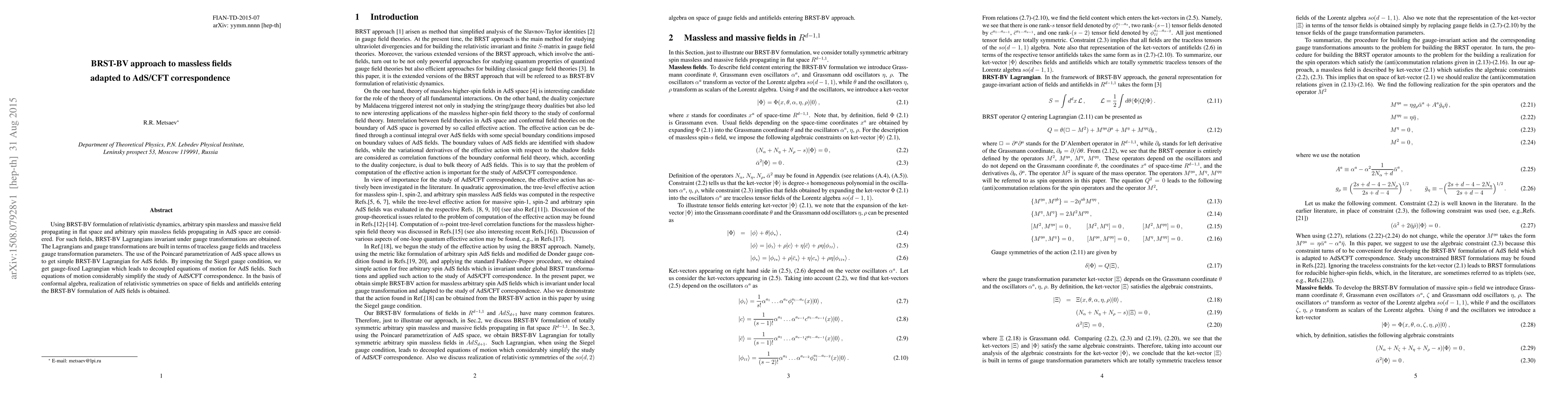 This paper employs the BRST-BV formulation to construct gauge-invariant Lagrangians for massless fields in both flat and AdS spaces, focusing on simplifying the AdS/CFT correspondence. The study uses Poincare parametrization and Siegel gauge to derive decoupled equations of motion for AdS fields, facilitating a clearer understanding of their relativistic symmetries.