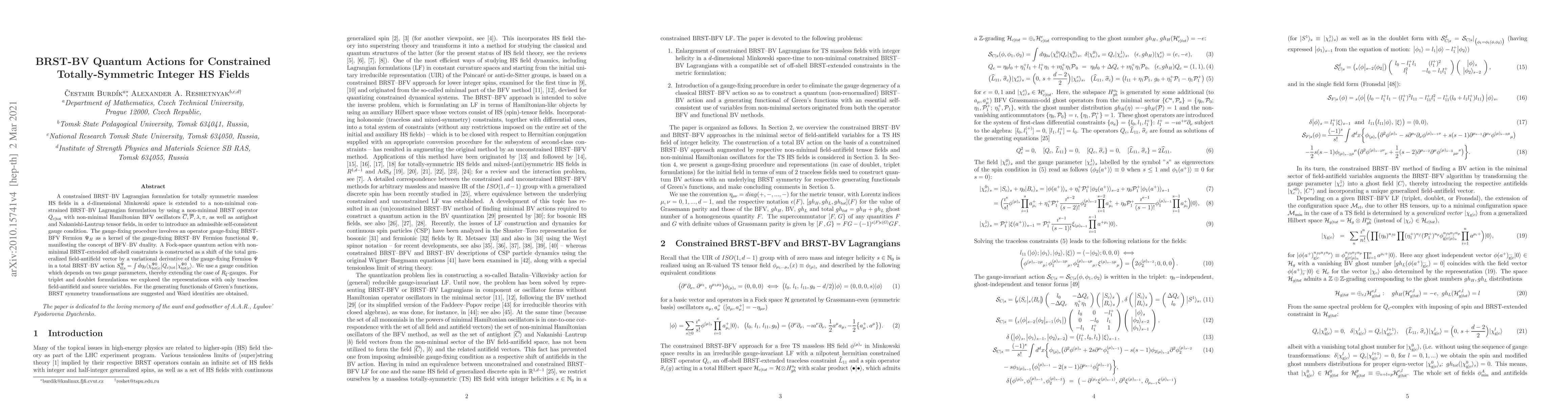 A constrained BRST-BV Lagrangian formulation for totally symmetric massless HS fields in a $d$-dimensional Minkowski space is extended to a non-minimal constrained BRST-BV Lagrangian formulation by using a non-minimal BRST operator $Q_{c|\mathrm{tot}}$ with non-minimal Hamiltonian BFV oscillators $\overline{C}, \overline{\mathcal{P}}, \lambda, \pi$, as well as antighost and Nakanishi-Lautrup tensor fields, in order to introduce an admissible self-consistent gauge condition. The gauge-fixing procedure involves an operator gauge-fixing BRST-BFV Fermion $\Psi_H$ as a kernel of the gauge-fixing BRST-BV Fermion functional $\Psi$, manifesting the concept of BFV-BV duality. A Fock-space quantum action with non-minimal BRST-extended off-shell constraints is constructed as a shift of the total generalized field-antifield vector by a variational derivative of the gauge-fixing Fermion $\Psi$ in a total BRST-BV action $S^{\Psi}_{0|s} = \int d \eta_0 \langle \chi^{\Psi{} 0}_{\mathrm{tot}|c} \big| Q_{c|\mathrm{tot}}\big| \chi^{\Psi{} 0}_{\mathrm{tot}|c}\rangle$. We use a gauge condition which depends on two gauge parameters, thereby extending the case of $R_\xi$-gauges. For triplet and duplet formulations we explored the representations with only traceless field-antifield and source variables. For the generating functionals of Green's functions, BRST symmetry transformations are suggested and Ward identities are obtained.