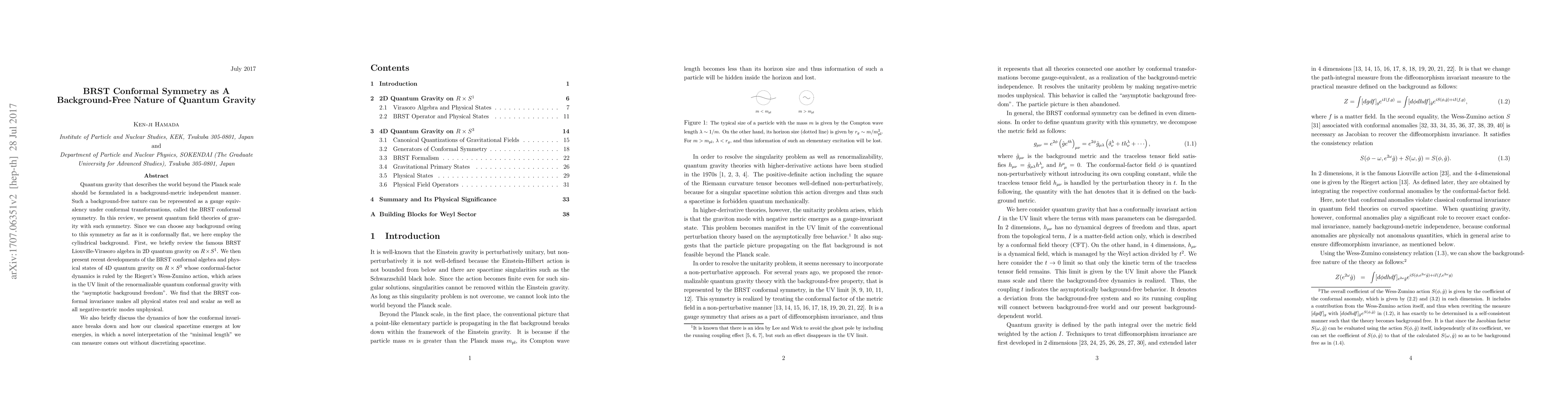 This paper reviews quantum field theories of gravity utilizing BRST conformal symmetry for a background-independent formulation. It demonstrates that BRST conformal invariance renders all physical states real and scalar while eliminating negative-metric modes, and discusses the breakdown of this symmetry to yield classical spacetime at low energies.