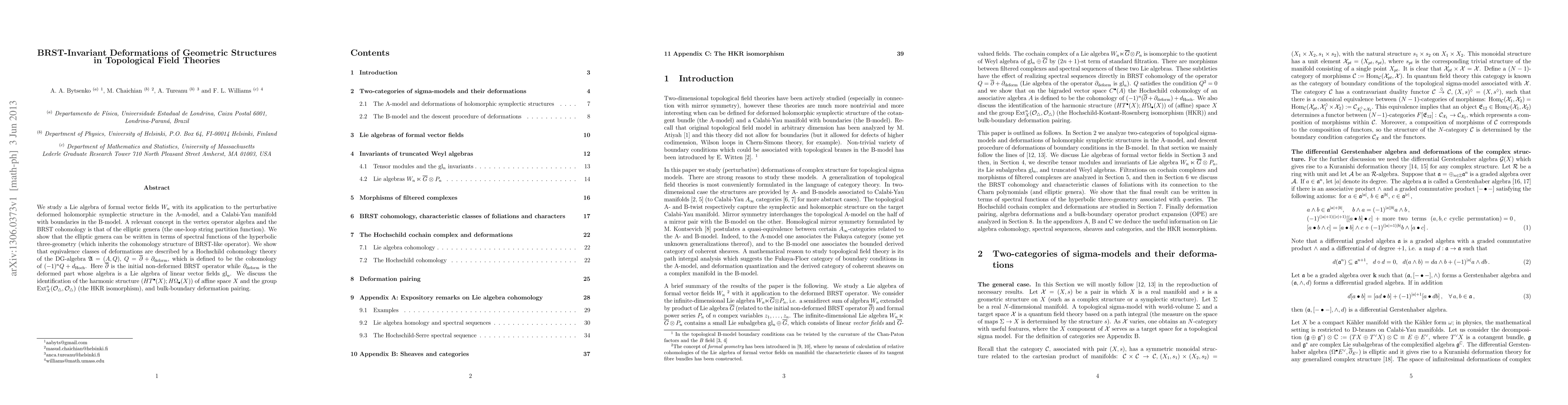 We study a Lie algebra of formal vector fields $W_n$ with its application to the perturbative deformed holomorphic symplectic structure in the A-model, and a Calabi-Yau manifold with boundaries in the B-model. A relevant concept in the vertex operator algebra and the BRST cohomology is that of the elliptic genera (the one-loop string partition function). We show that the elliptic genera can be written in terms of spectral functions of the hyperbolic three-geometry (which inherits the cohomology structure of BRST-like operator). We show that equivalence classes of deformations are described by a Hochschild cohomology theory of the DG-algebra ${\mathfrak A} = (A, Q)$, $Q =\bar{\partial}+\partial_{\rm deform}$, which is defined to be the cohomology of $(-1)^n Q +d_{\rm Hoch}$. Here $\bar{\partial}$ is the initial non-deformed BRST operator while $\partial_{\rm deform}$ is the deformed part whose algebra is a Lie algebra of linear vector fields ${\rm gl}_n$. We discuss the identification of the harmonic structure $(HT^\bullet(X); H\Omega_\bullet(X))$ of affine space $X$ and the group ${\rm Ext}_{X}^n({\cal O}_{\triangle}, {\cal O}_{\triangle})$ (the HKR isomorphism), and bulk-boundary deformation pairing.