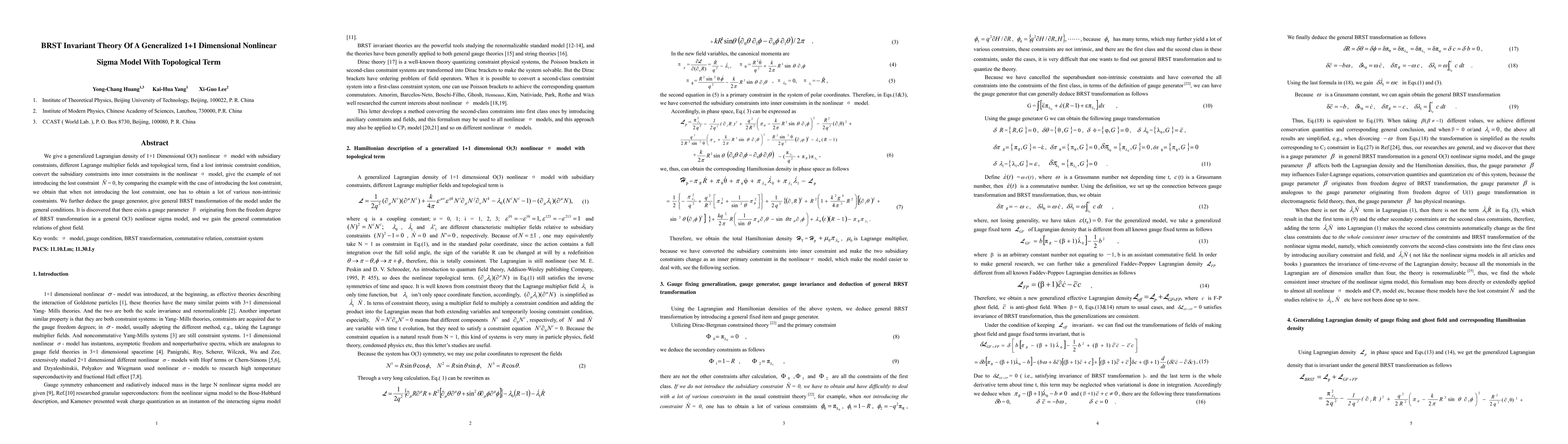 The research generalizes the Lagrangian density of a 1+1 dimensional O(3) nonlinear sigma model, incorporating subsidiary constraints, Lagrange multipliers, and a topological term. It finds a lost intrinsic constraint, converts subsidiary constraints into inner constraints, and introduces a gauge parameter β originating from BRST transformation freedom degree.