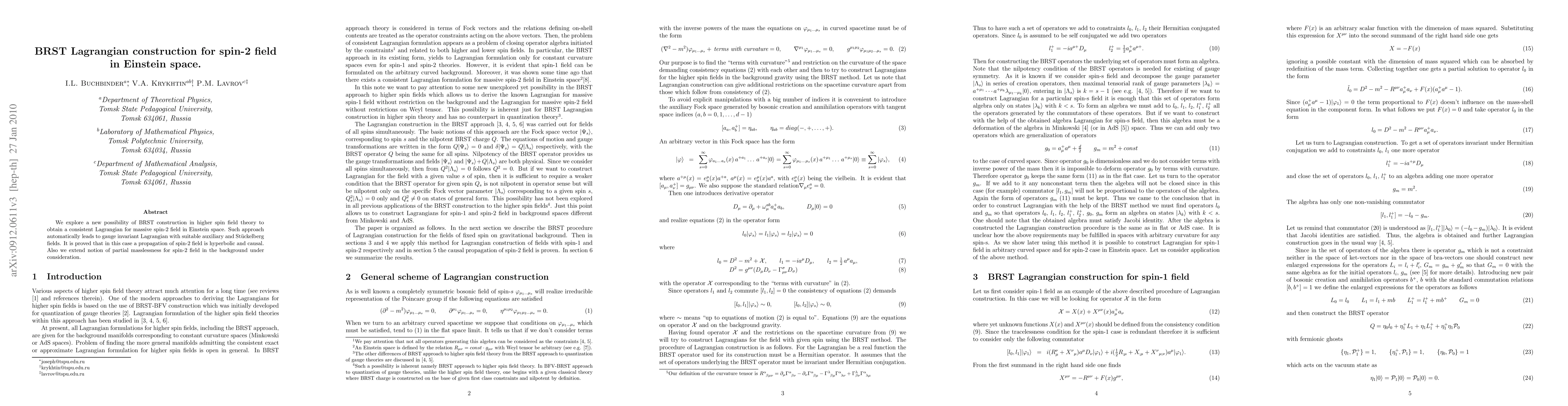 The paper presents a novel BRST Lagrangian construction method for higher spin fields, specifically demonstrating its effectiveness for a massive spin-2 field in Einstein space, ensuring gauge invariance and hyperbolic propagation.
