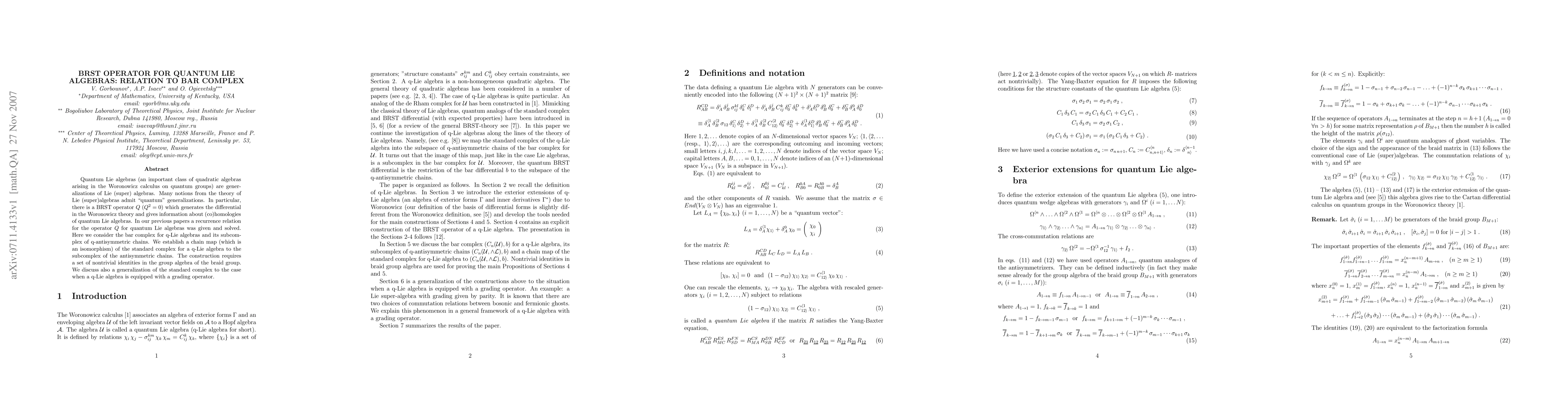 Quantum Lie algebras (an important class of quadratic algebras arising in the Woronowicz calculus on quantum groups) are generalizations of Lie (super) algebras. Many notions from the theory of Lie (super)algebras admit ``quantum'' generalizations. In particular, there is a BRST operator Q (Q^2=0) which generates the differential in the Woronowicz theory and gives information about (co)homologies of quantum Lie algebras. In our previous papers a recurrence relation for the operator Q for quantum Lie algebras was given and solved. Here we consider the bar complex for q-Lie algebras and its subcomplex of q-antisymmetric chains. We establish a chain map (which is an isomorphism) of the standard complex for a q-Lie algebra to the subcomplex of the antisymmetric chains. The construction requires a set of nontrivial identities in the group algebra of the braid group. We discuss also a generalization of the standard complex to the case when a q-Lie algebra is equipped with a grading operator.