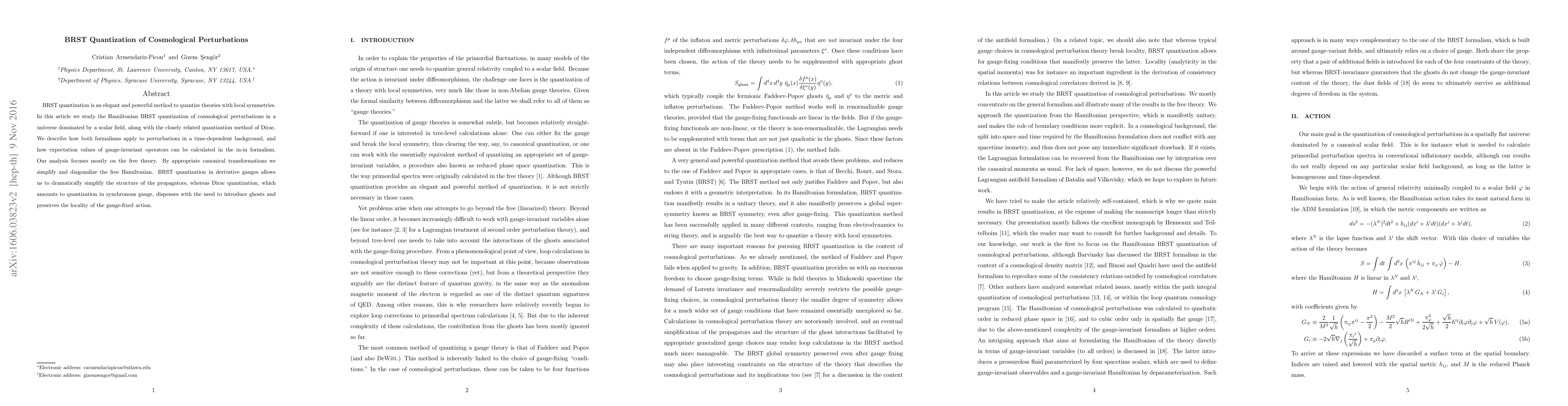 This paper examines the Hamiltonian BRST quantization of cosmological perturbations in a scalar field-dominated universe, comparing it with Dirac quantization. It simplifies and diagonalizes the free Hamiltonian using canonical transformations, finding that BRST quantization in derivative gauges simplifies propagators, while synchronous gauge quantization maintains locality without introducing ghosts.