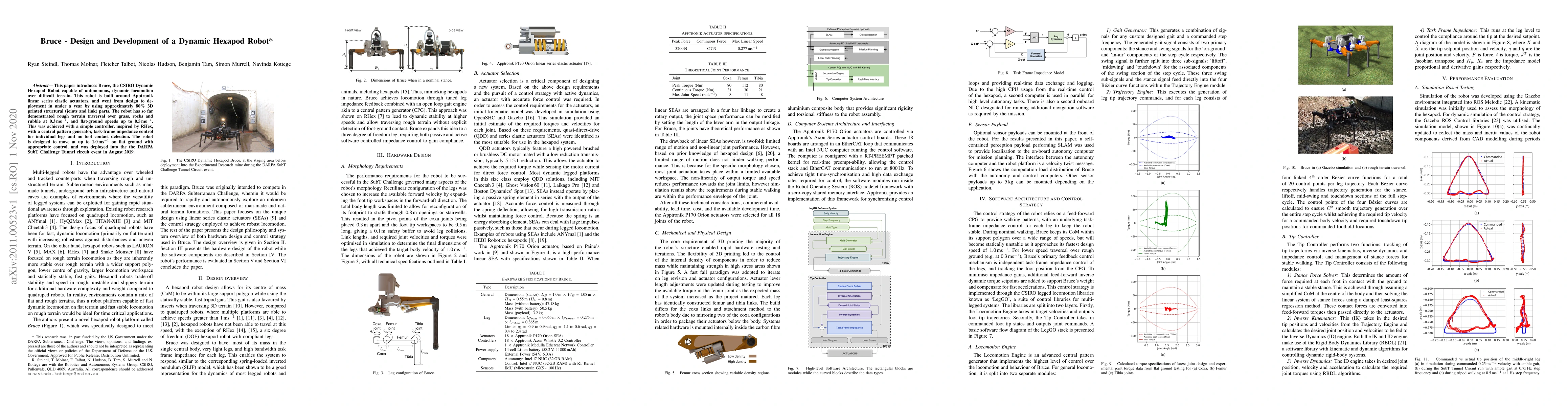 This paper details the design and development of Bruce, a dynamic hexapod robot by CSIRO, which utilizes 3D printed components and linear series elastic actuators for autonomous locomotion over challenging terrains. The robot achieved speeds up to 0.5m/s on flat ground and was deployed in the DARPA SubT Challenge in 2019.