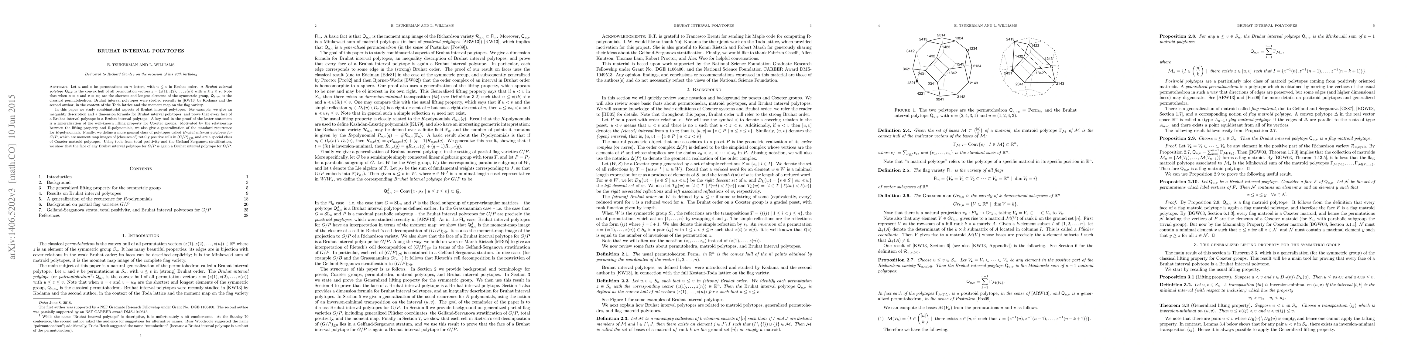 Let u and v be permutations on n letters, with u <= v in Bruhat order. A Bruhat interval polytope Q_{u,v} is the convex hull of all permutation vectors z = (z(1), z(2),...,z(n)) with u <= z <= v. Note that when u=e and v=w_0 are the shortest and longest elements of the symmetric group, Q_{e,w_0} is the classical permutohedron. Bruhat interval polytopes were studied recently by Kodama and the second author, in the context of the Toda lattice and the moment map on the flag variety. In this paper we study combinatorial aspects of Bruhat interval polytopes. For example, we give an inequality description and a dimension formula for Bruhat interval polytopes, and prove that every face of a Bruhat interval polytope is a Bruhat interval polytope. A key tool in the proof of the latter statement is a generalization of the well-known lifting property for Coxeter groups. Motivated by the relationship between the lifting property and R-polynomials, we also give a generalization of the standard recurrence for R-polynomials. Finally, we define a more general class of polytopes called Bruhat interval polytopes for G/P, which are moment map images of (closures of) totally positive cells in the non-negative part of G/P, and are a special class of Coxeter matroid polytopes. Using tools from total positivity and the Gelfand-Serganova stratification, we show that the face of any Bruhat interval polytope for G/P is again a Bruhat interval polytope for G/P.