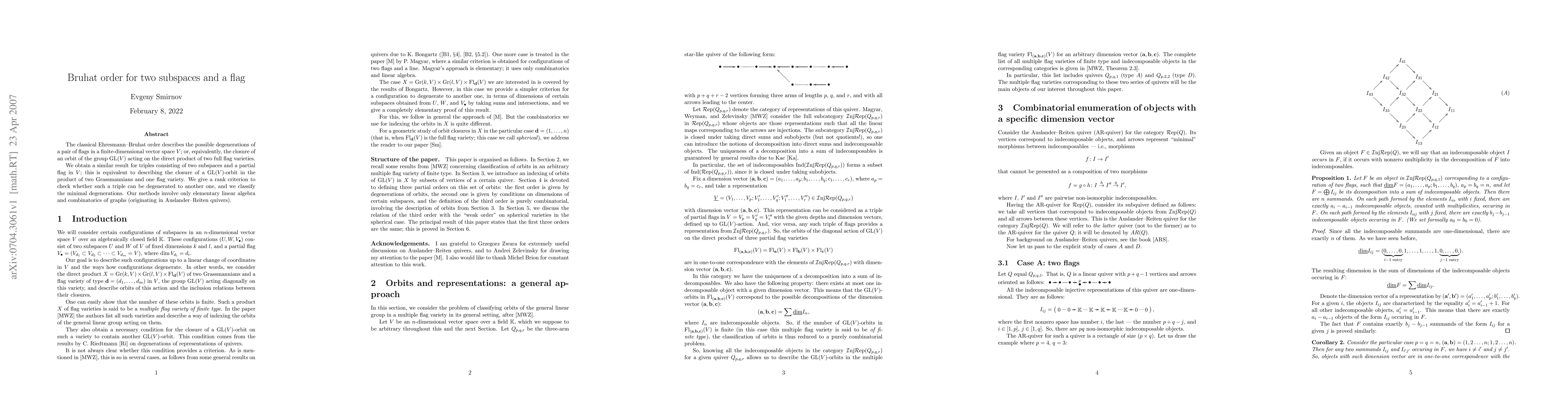 The paper extends the classical Bruhat order to triples consisting of two subspaces and a partial flag, describing the closure of a GL(V)-orbit in the product of two Grassmannians and one flag variety, and provides a rank criterion for degenerations along with a classification of minimal degenerations. The methods utilize elementary linear algebra and combinatorial graph theory.