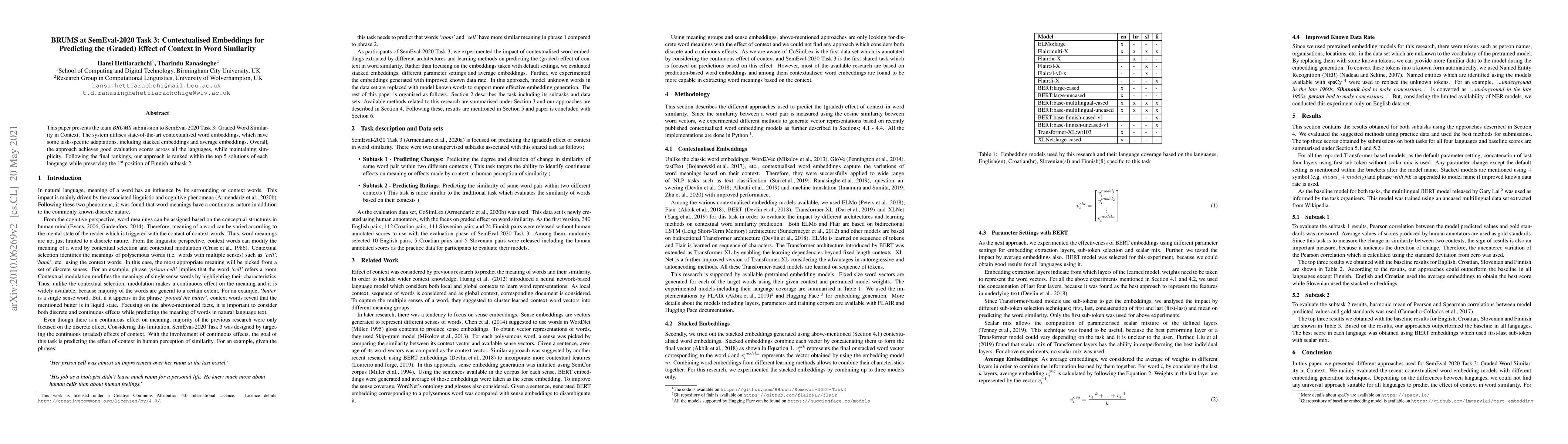 Title: BRUMS at SemEval-2020 Task 3: Contextualised Embeddings for Predicting the (Graded) Effect of Context in Word Similarity Summary: The BRUMS team's submission for SemEval-2020 Task 3 employs contextualised word embeddings with task-specific adaptations, achieving top-5 rankings in all languages and securing the 1st position in Finnish subtask 2, demonstrating effective utilisation of simplicity and advanced techniques.