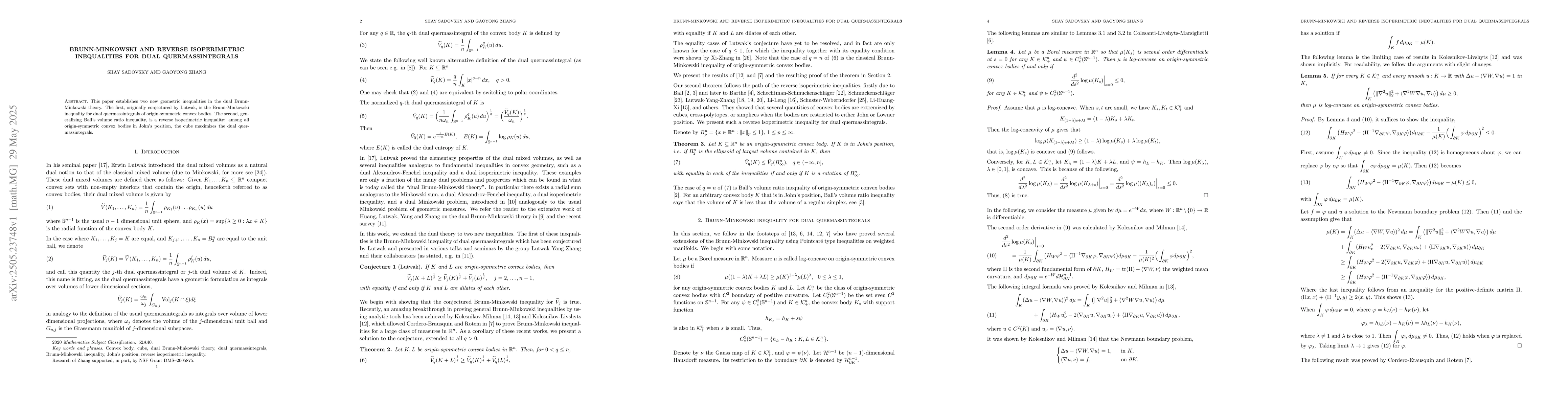 The paper introduces new inequalities for dual quermassintegrals, leveraging log-concavity properties and advanced integral formulas.
