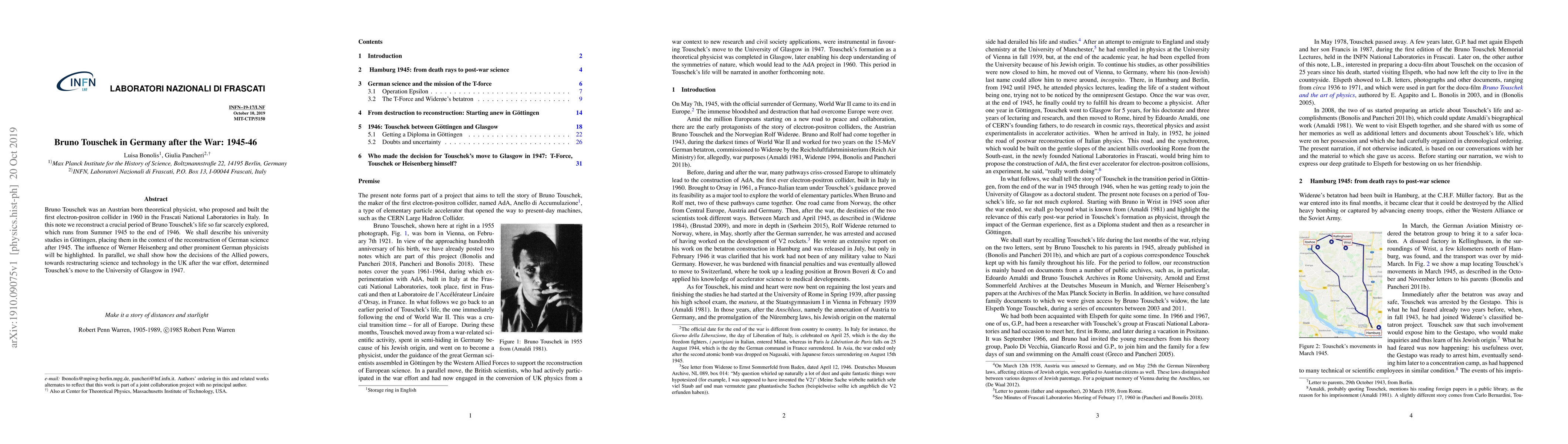 Bruno Touschek was an Austrian born theoretical physicist, who proposed and built the first electron-positron collider in 1960 in the Frascati National Laboratories in Italy. In this note we reconstruct a crucial period of Bruno Touschek's life so far scarcely explored, which runs from Summer 1945 to the end of 1946. We shall describe his university studies in G\"ottingen, placing them in the context of the reconstruction of German science after 1945. The influence of Werner Heisenberg and other prominent German physicists will be highlighted. In parallel, we shall show how the decisions of the Allied powers towards restructuring science and technology in the UK after the war effort, determined Touschek's move to the University of Glasgow in 1947.