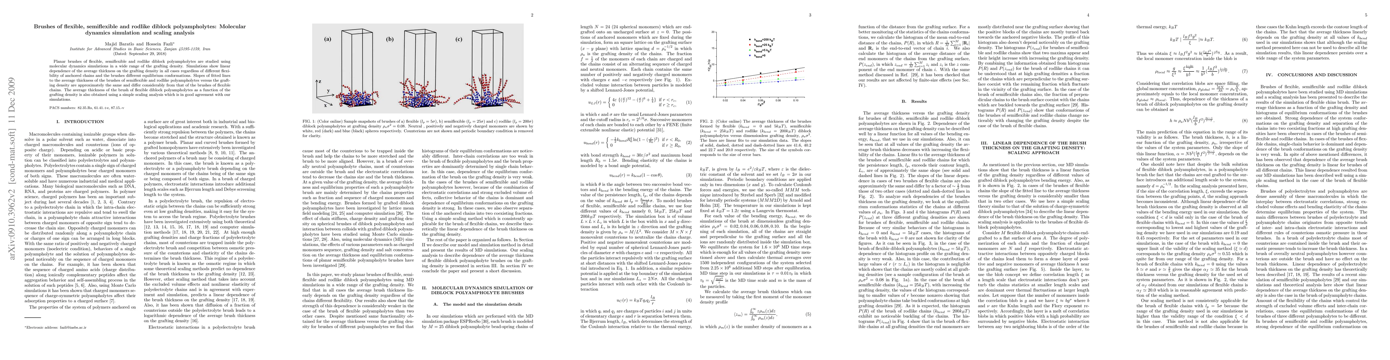 Researchers studied how the thickness of diblock polyampholyte brushes changes with grafting density using simulations and scaling analysis, finding that flexible chains have a different slope than semiflexible and rodlike chains.
