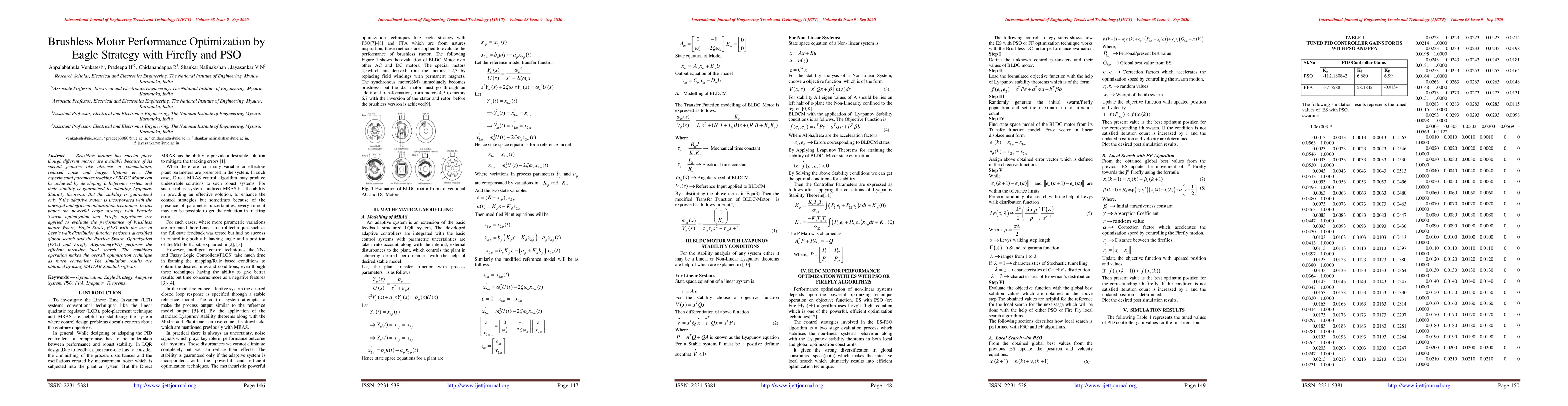 This paper optimizes brushless motor performance using a combination of Eagle Strategy with Particle Swarm Optimization and Firefly Algorithm, achieving improved efficiency and stability through diverse global search and intensive local search.