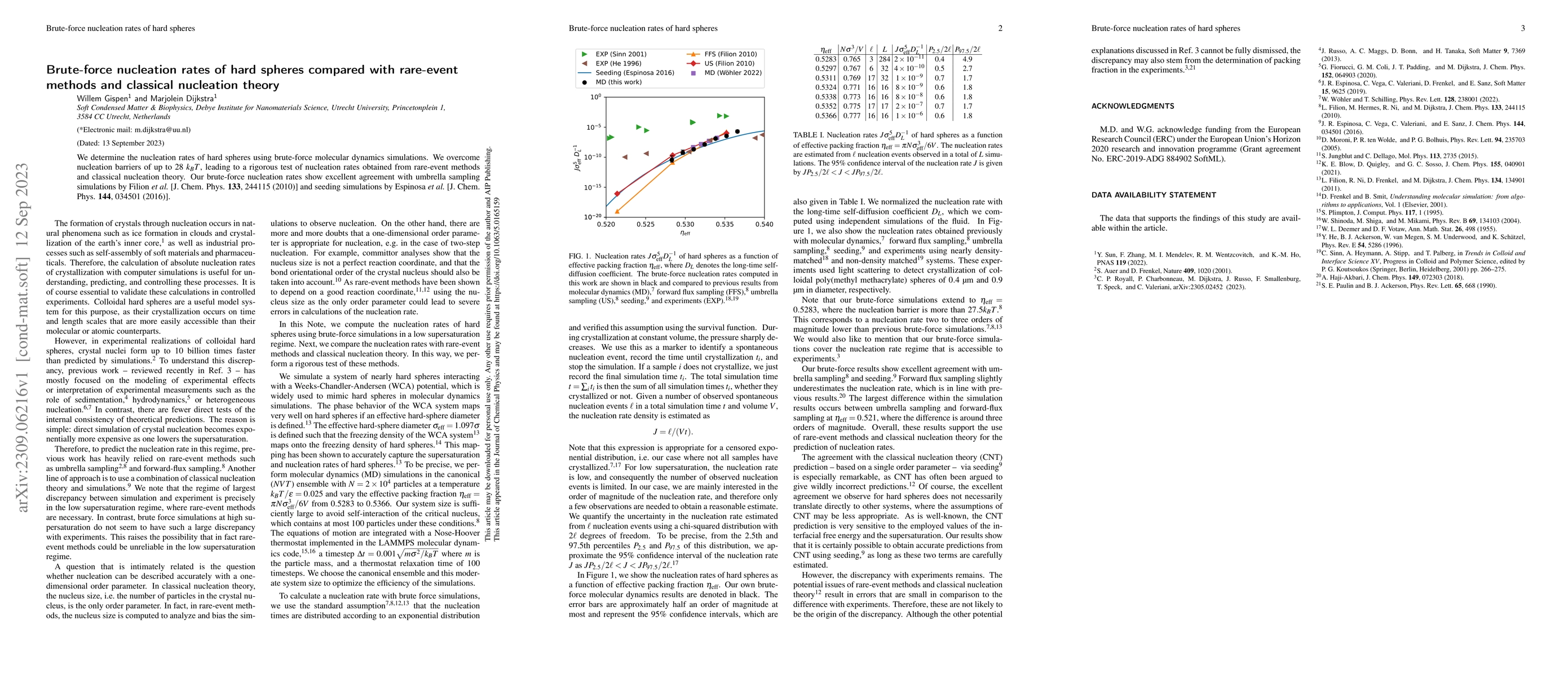 This paper compares nucleation rates of hard spheres derived from brute-force molecular dynamics simulations with those from rare-event methods and classical nucleation theory, showing strong agreement with previous umbrella sampling and seeding simulations. The study rigorously tests the accuracy of these theoretical approaches.