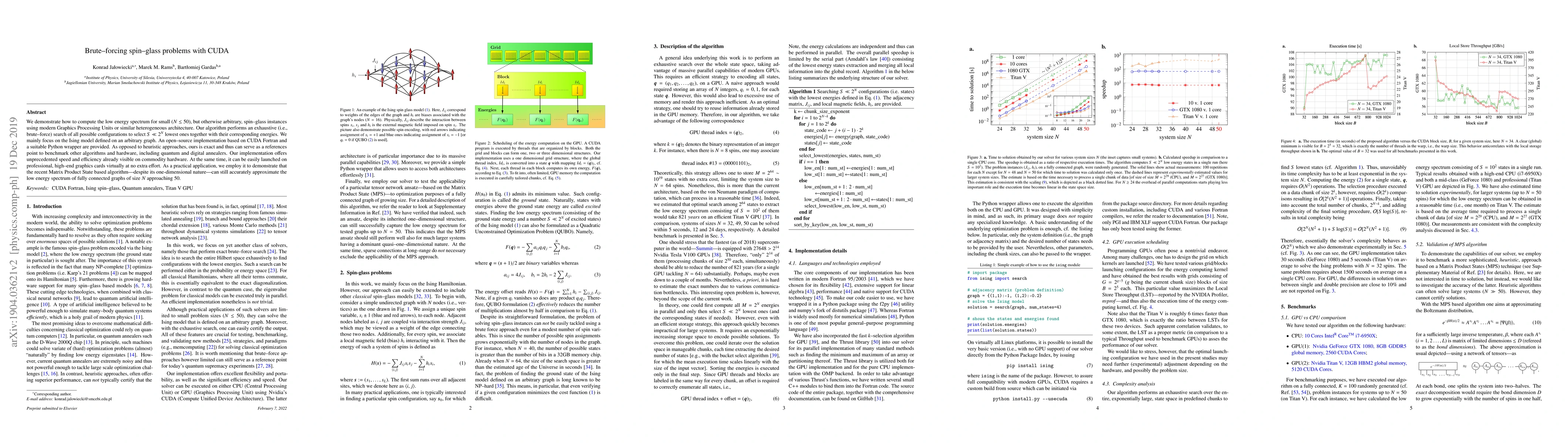 We demonstrate how to compute the low energy spectrum for small ($N\le 50$), but otherwise arbitrary, spin-glass instances using modern Graphics Processing Units or similar heterogeneous architecture. Our algorithm performs an exhaustive (i.e., brute-force) search of all possible configurations to select $S\ll 2^N$ lowest ones together with their corresponding energies. We mainly focus on the Ising model defined on an arbitrary graph. An open-source implementation based on CUDA Fortran and a suitable Python wrapper are provided. As opposed to heuristic approaches, ours is exact and thus can serve as a references point to benchmark other algorithms and hardware, including quantum and digital annealers. Our implementation offers unprecedented speed and efficiency already visible on commodity hardware. At the same time, it can be easily launched on professional, high-end graphics cards virtually at no extra effort. As a practical application, we employ it to demonstrate that the recent Matrix Product State based algorithm-despite its one-dimensional nature-can still accurately approximate the low energy spectrum of fully connected graphs of size $N$ approaching $50$.