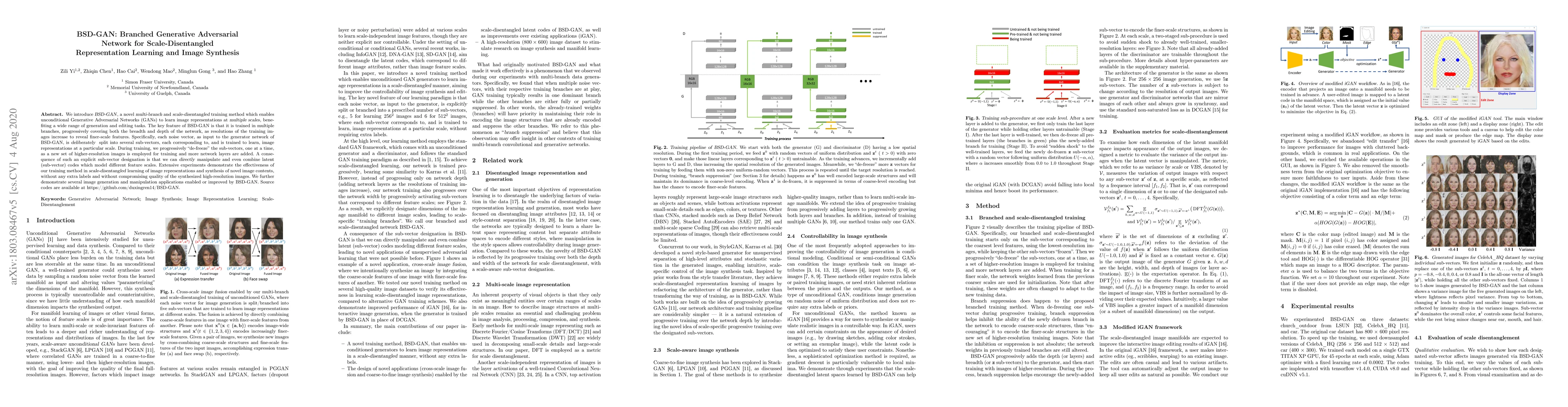 BSD-GAN introduces a multi-branch training method for Generative Adversarial Networks that learns scale-disentangled image representations, enabling high-quality image generation and editing across various resolutions. The method splits noise vectors into sub-vectors for different scales, progressively revealing finer-scale features as training progresses.
