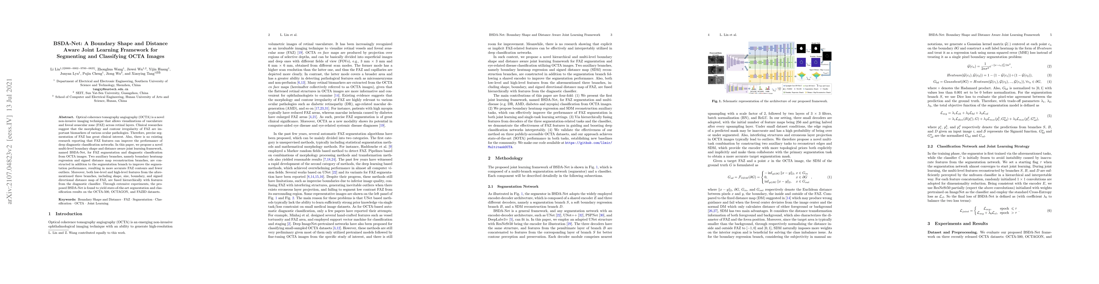 Optical coherence tomography angiography (OCTA) is a novel non-invasive imaging technique that allows visualizations of vasculature and foveal avascular zone (FAZ) across retinal layers. Clinical researches suggest that the morphology and contour irregularity of FAZ are important biomarkers of various ocular pathologies. Therefore, precise segmentation of FAZ has great clinical interest. Also, there is no existing research reporting that FAZ features can improve the performance of deep diagnostic classification networks. In this paper, we propose a novel multi-level boundary shape and distance aware joint learning framework, named BSDA-Net, for FAZ segmentation and diagnostic classification from OCTA images. Two auxiliary branches, namely boundary heatmap regression and signed distance map reconstruction branches, are constructed in addition to the segmentation branch to improve the segmentation performance, resulting in more accurate FAZ contours and fewer outliers. Moreover, both low-level and high-level features from the aforementioned three branches, including shape, size, boundary, and signed directional distance map of FAZ, are fused hierarchically with features from the diagnostic classifier. Through extensive experiments, the proposed BSDA-Net is found to yield state-of-the-art segmentation and classification results on the OCTA-500, OCTAGON, and FAZID datasets.