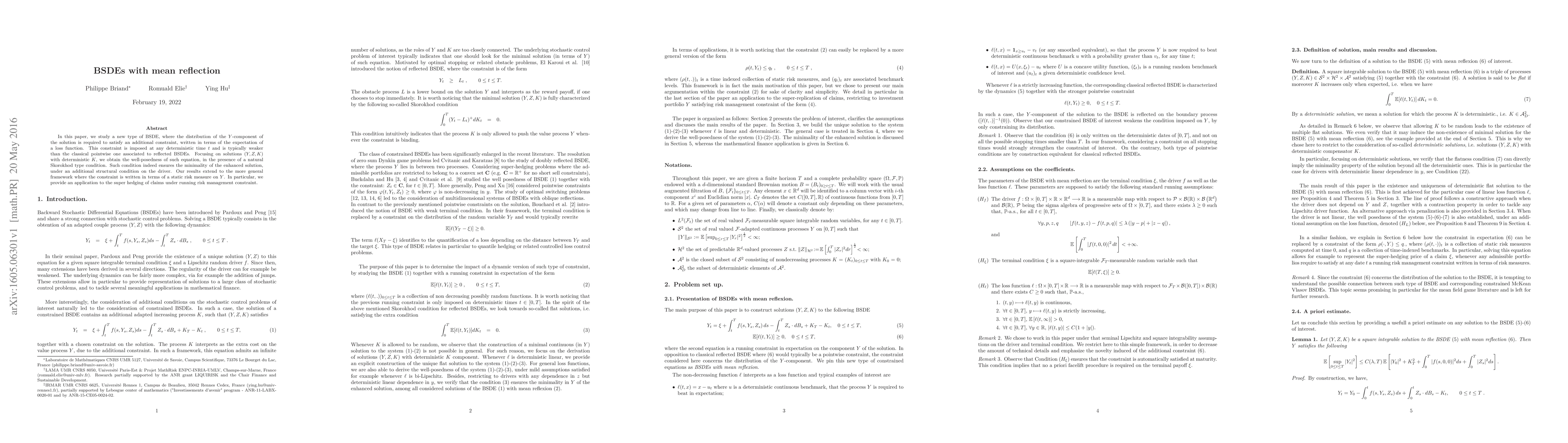 In this paper, we study a new type of BSDE, where the distribution of the Y-component of the solution is required to satisfy an additional constraint, written in terms of the expectation of a loss function. This constraint is imposed at any deterministic time t and is typically weaker than the classical pointwise one associated to reflected BSDEs. Focusing on solutions (Y, Z, K) with deterministic K, we obtain the well-posedness of such equation, in the presence of a natural Skorokhod type condition. Such condition indeed ensures the minimality of the enhanced solution, under an additional structural condition on the driver. Our results extend to the more general framework where the constraint is written in terms of a static risk measure on Y. In particular, we provide an application to the super hedging of claims under running risk management constraint.