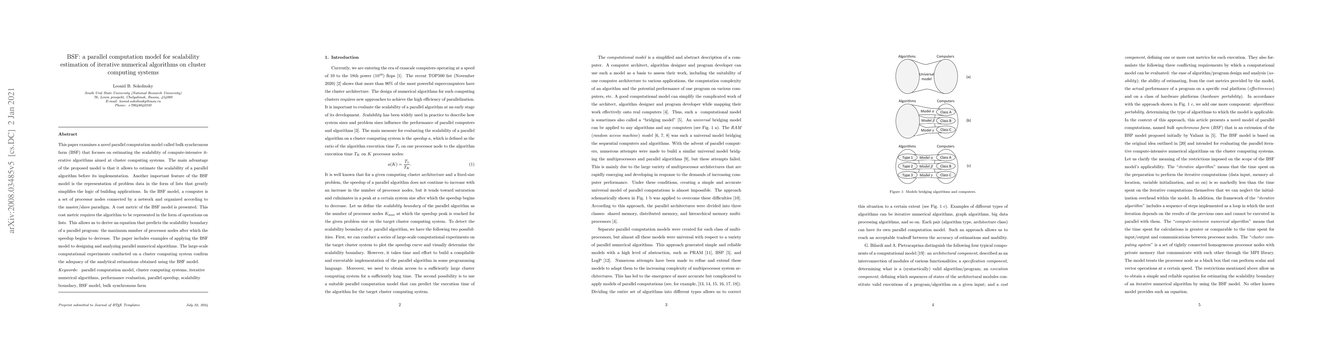 This paper examines a new parallel computation model called bulk synchronous farm (BSF) that focuses on estimating the scalability of compute-intensive iterative algorithms aimed at cluster computing systems. In the BSF model, a computer is a set of processor nodes connected by a network and organized according to the master/slave paradigm. A cost metric of the BSF model is presented. This cost metric requires the algorithm to be represented in the form of operations on lists. This allows us to derive an equation that predicts the scalability boundary of a parallel program: the maximum number of processor nodes after which the speedup begins to decrease. The paper includes several examples of applying the BSF model to designing and analyzing parallel nu-merical algorithms. The large-scale computational experiments conducted on a cluster computing system confirm the adequacy of the analytical estimations obtained using the BSF model.