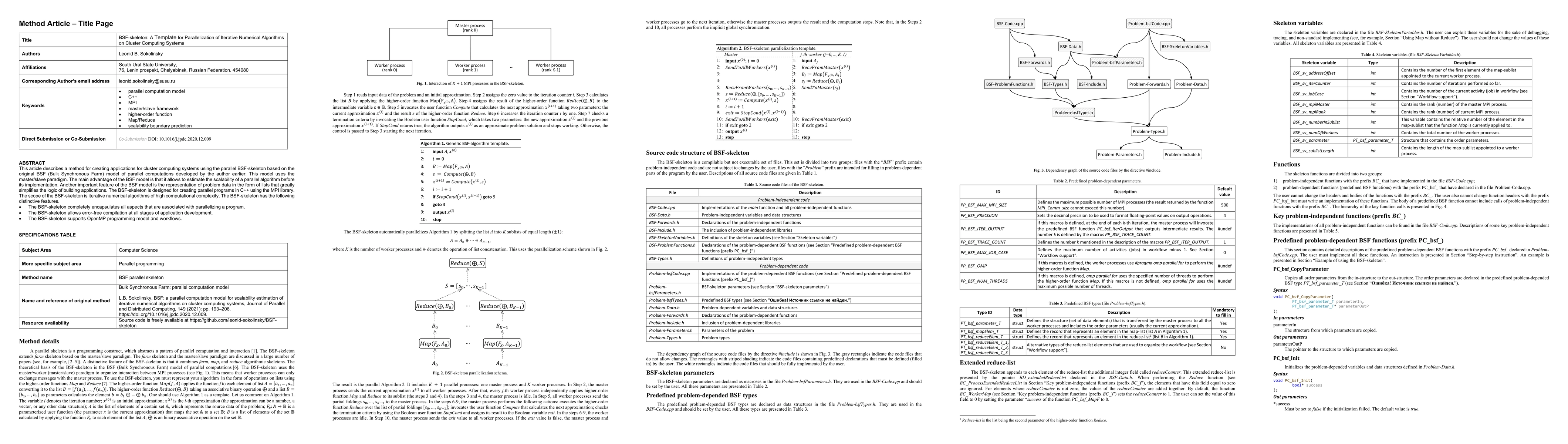This paper introduces the BSF-skeleton, a method for parallelizing iterative numerical algorithms on cluster computing systems using the BSF model, which allows scalability estimation and simplifies problem data representation. The BSF-skeleton encapsulates parallelization aspects and supports OpenMP, facilitating error-free compilation.