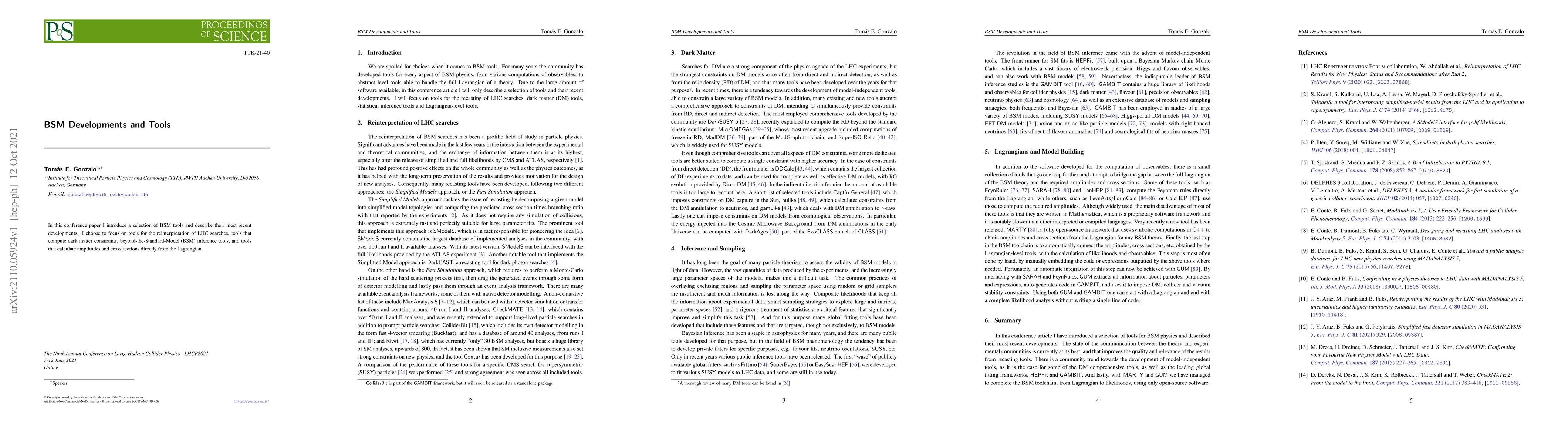 This paper reviews recent advancements in BSM tools, focusing on those reinterpreting LHC searches, computing dark matter constraints, inferring beyond-the-Standard-Model physics, and calculating amplitudes and cross sections directly from the Lagrangian.